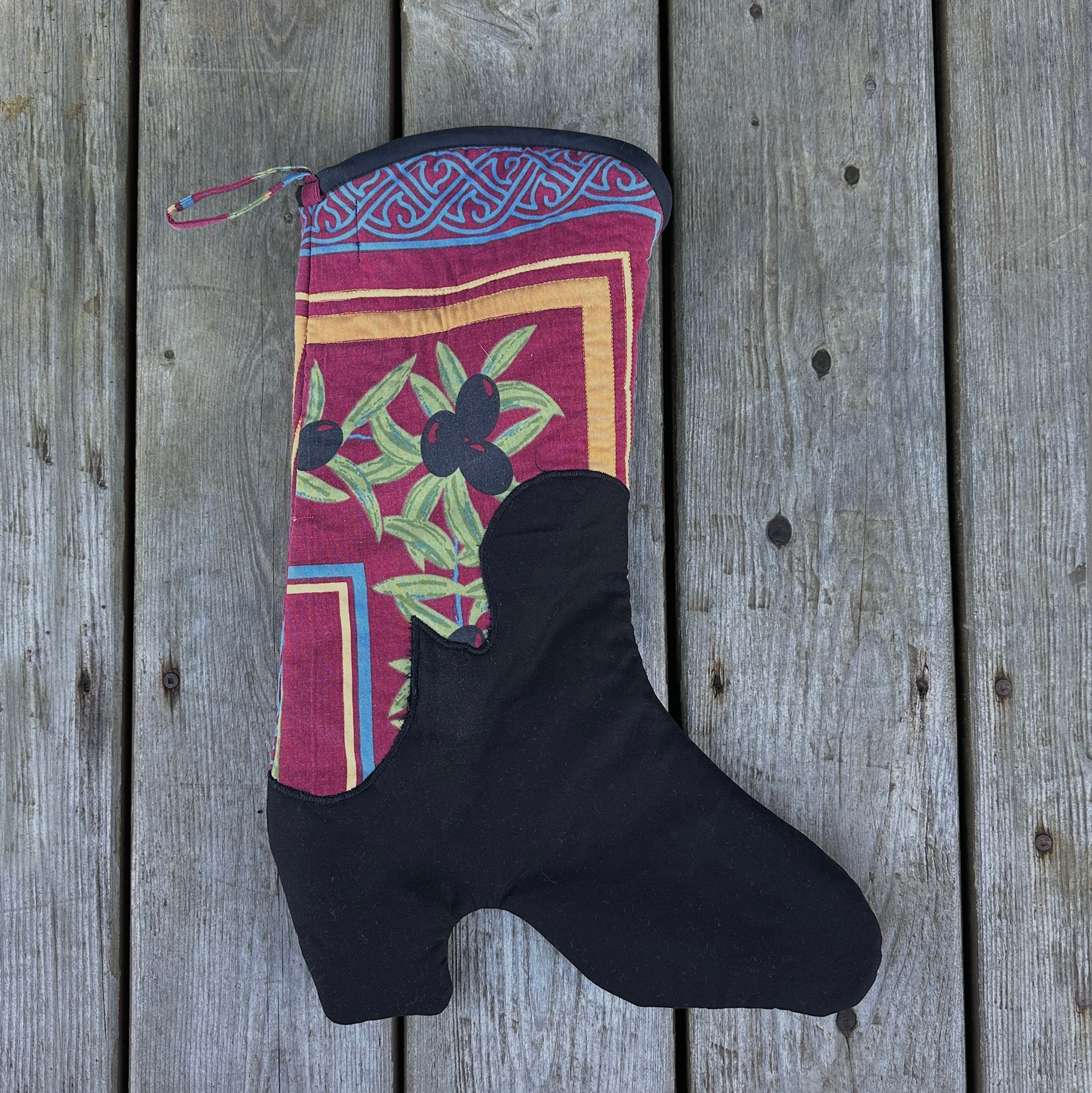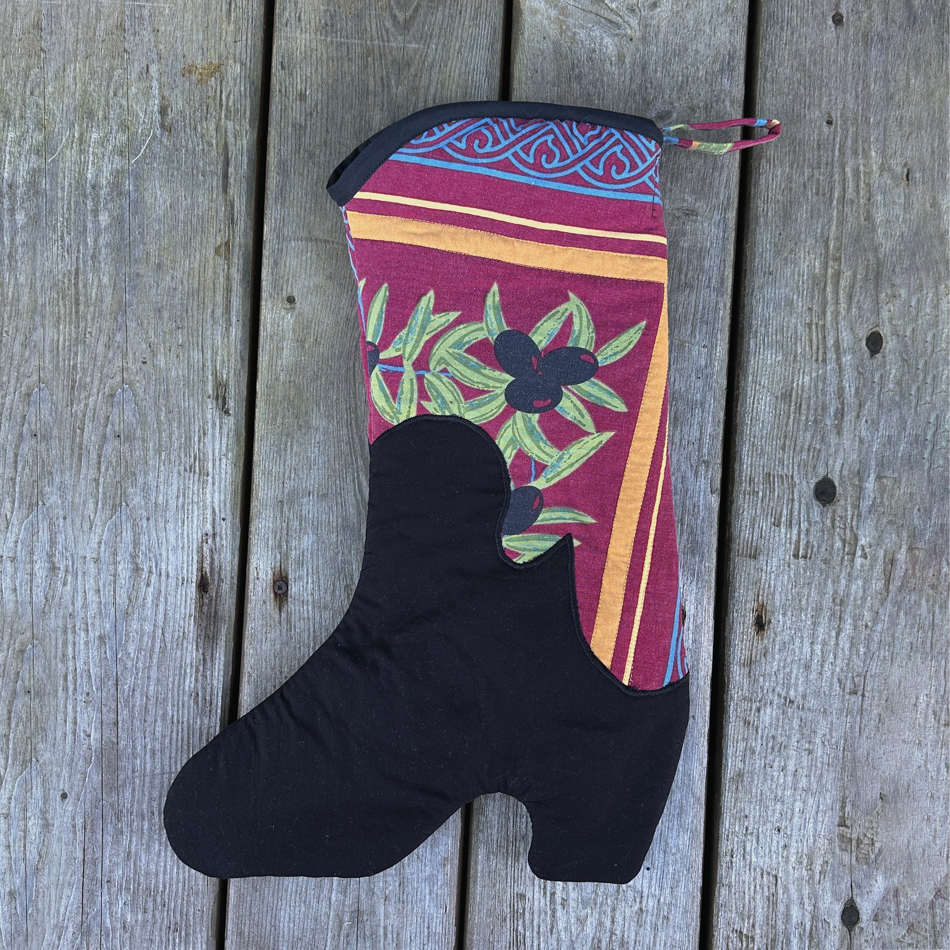 one of a kind, handmade stocking crafted with recycled quilts and fabrics. fully lined, with a hang tab on the back of the boot.