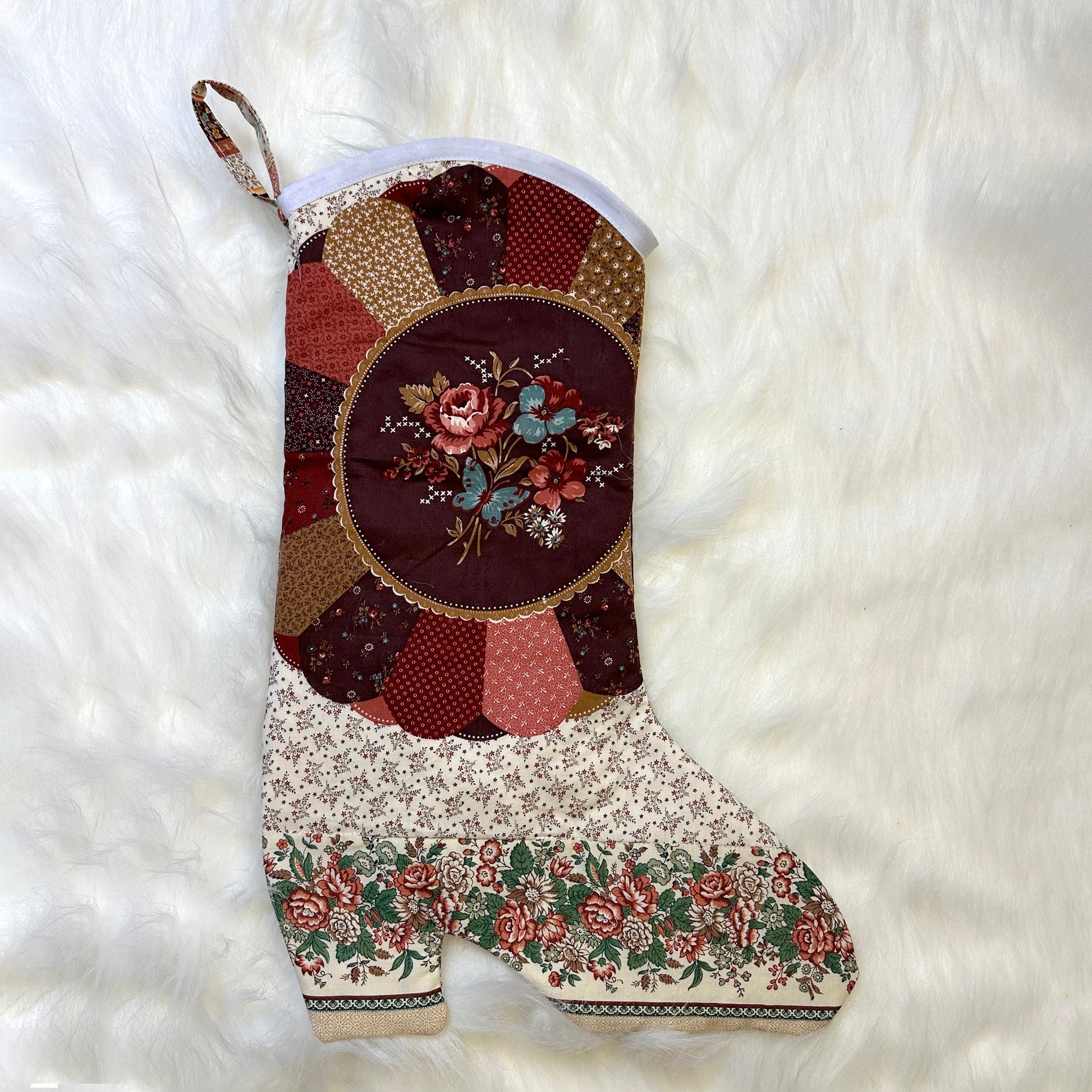 one of a kind, handmade stocking crafted with recycled quilts and fabrics. fully lined, with a hang tab on the back of the boot.