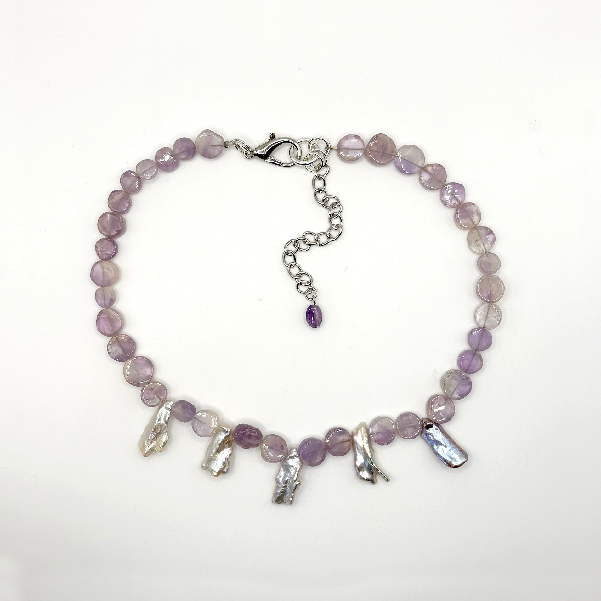 one of a kind necklace made of amethyst coins and freshwater pearls.