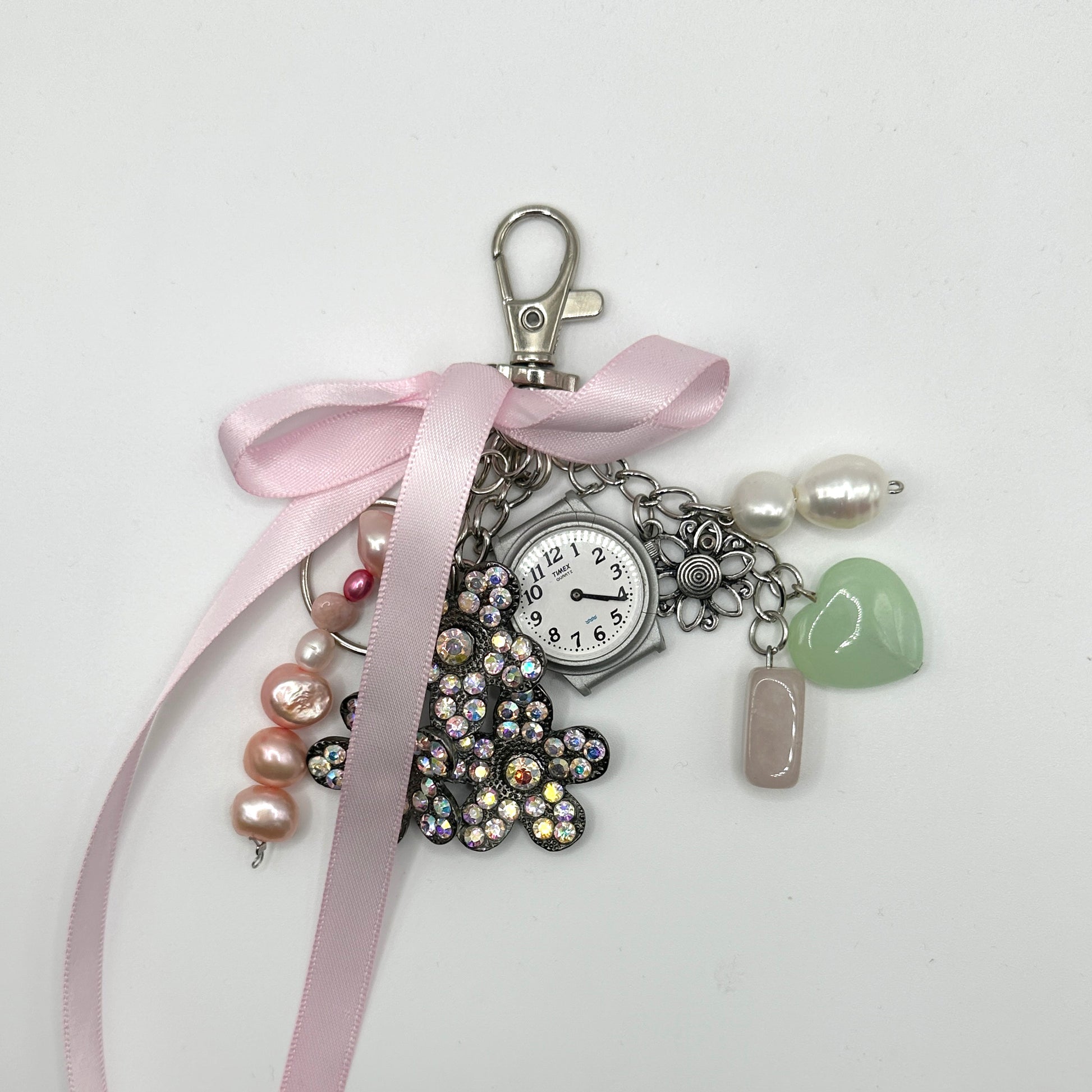 one of a kind clip on bag charm. filled with vintage pendants and charms, freshwater pearls, rose quartz and jade crystals. with keychain