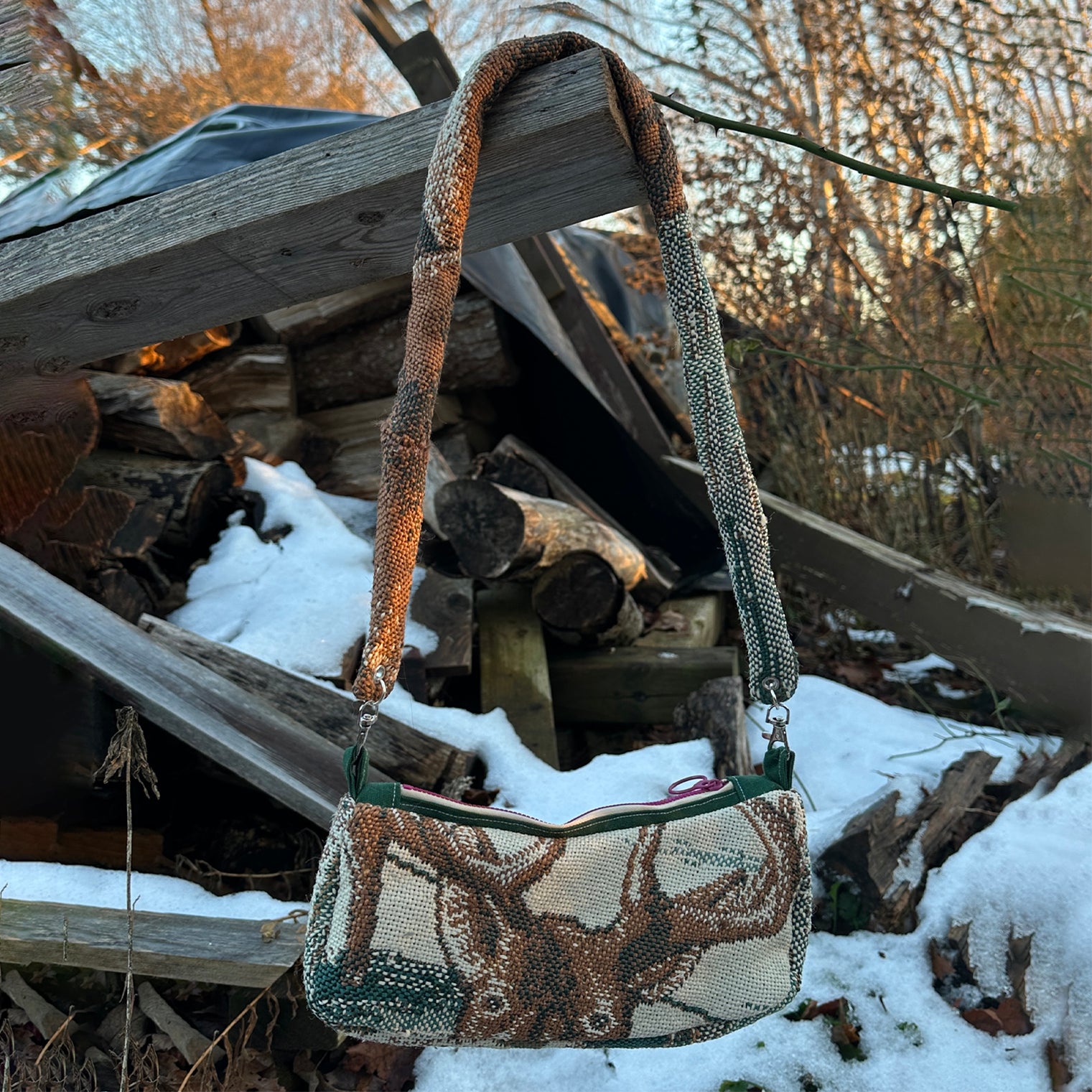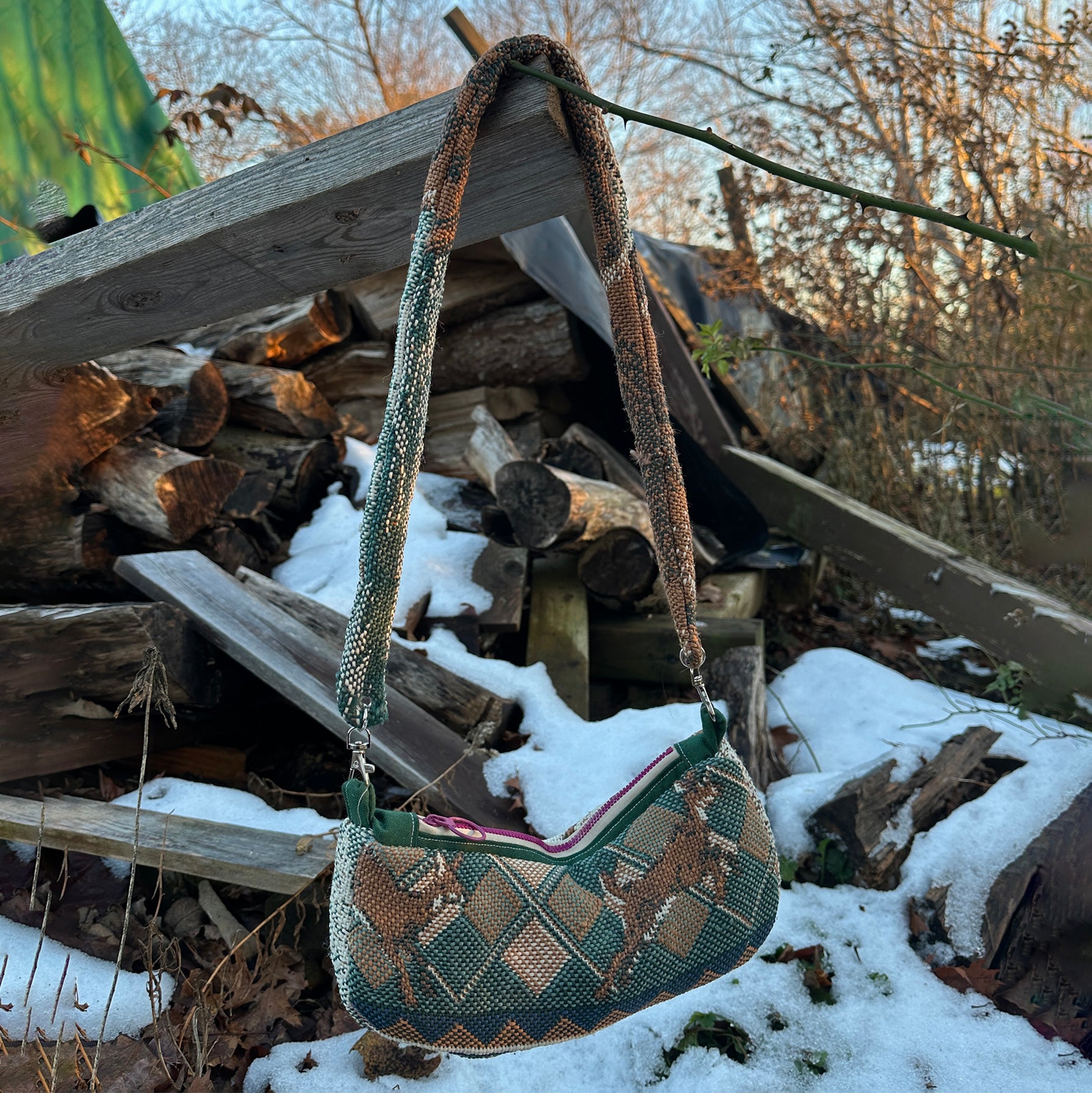 one of a kind mini bag made with recycled materials. fully lined with over the shoulder clip on straps and a zipper closure.