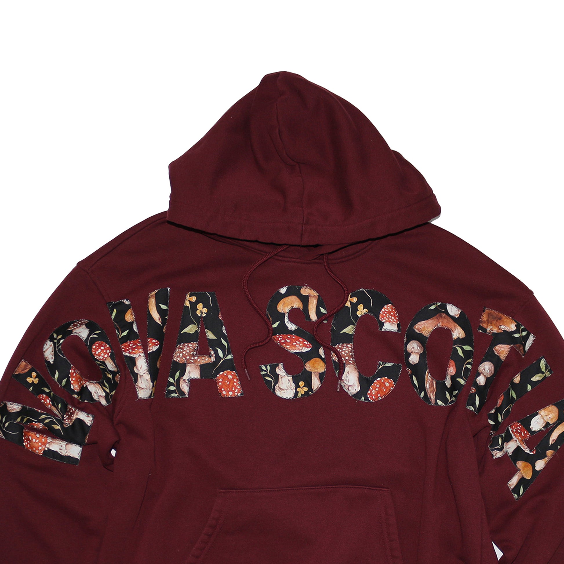 nova scotia applique hoodie with mushroom printed letters. made with secondhand materials