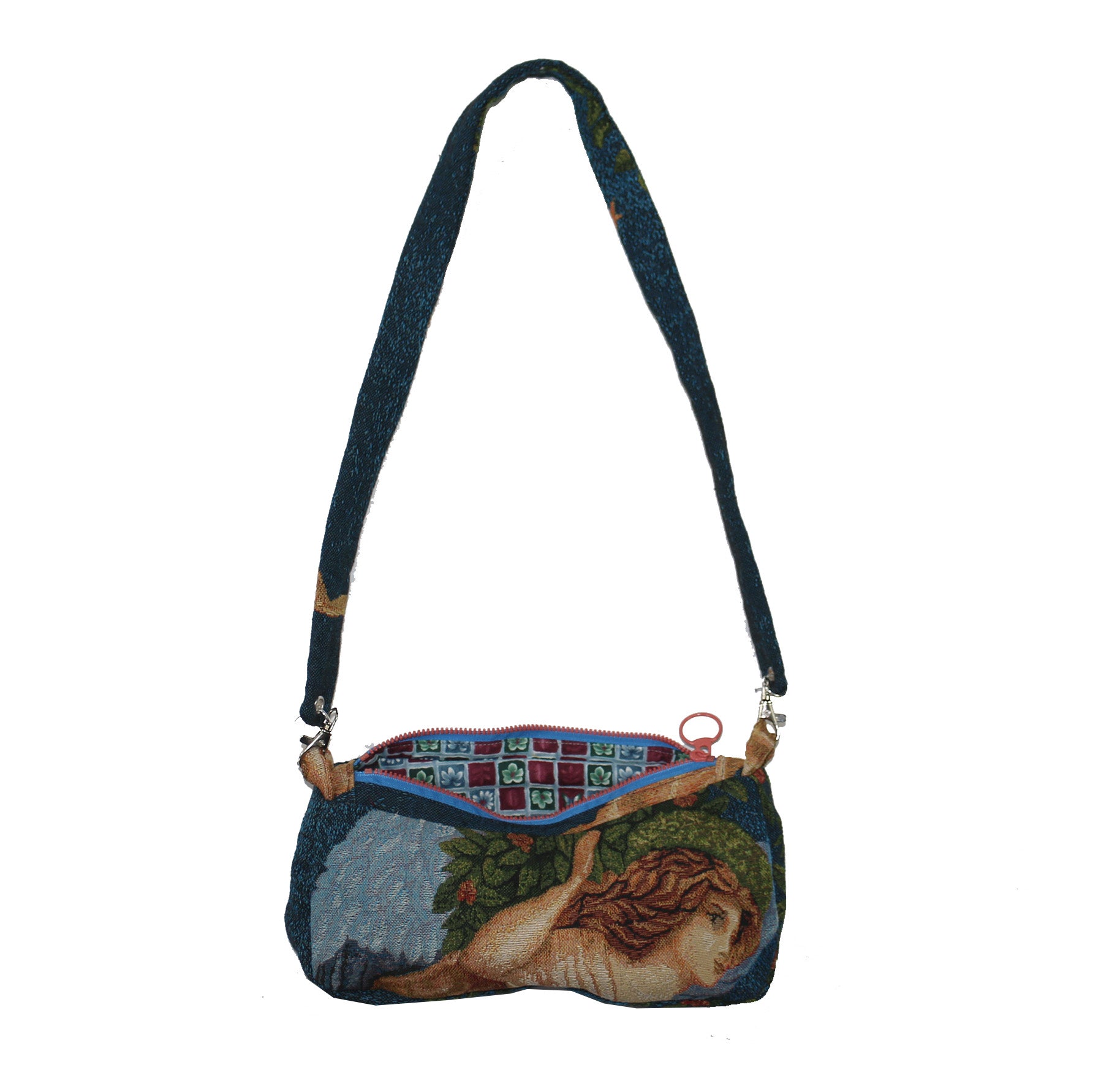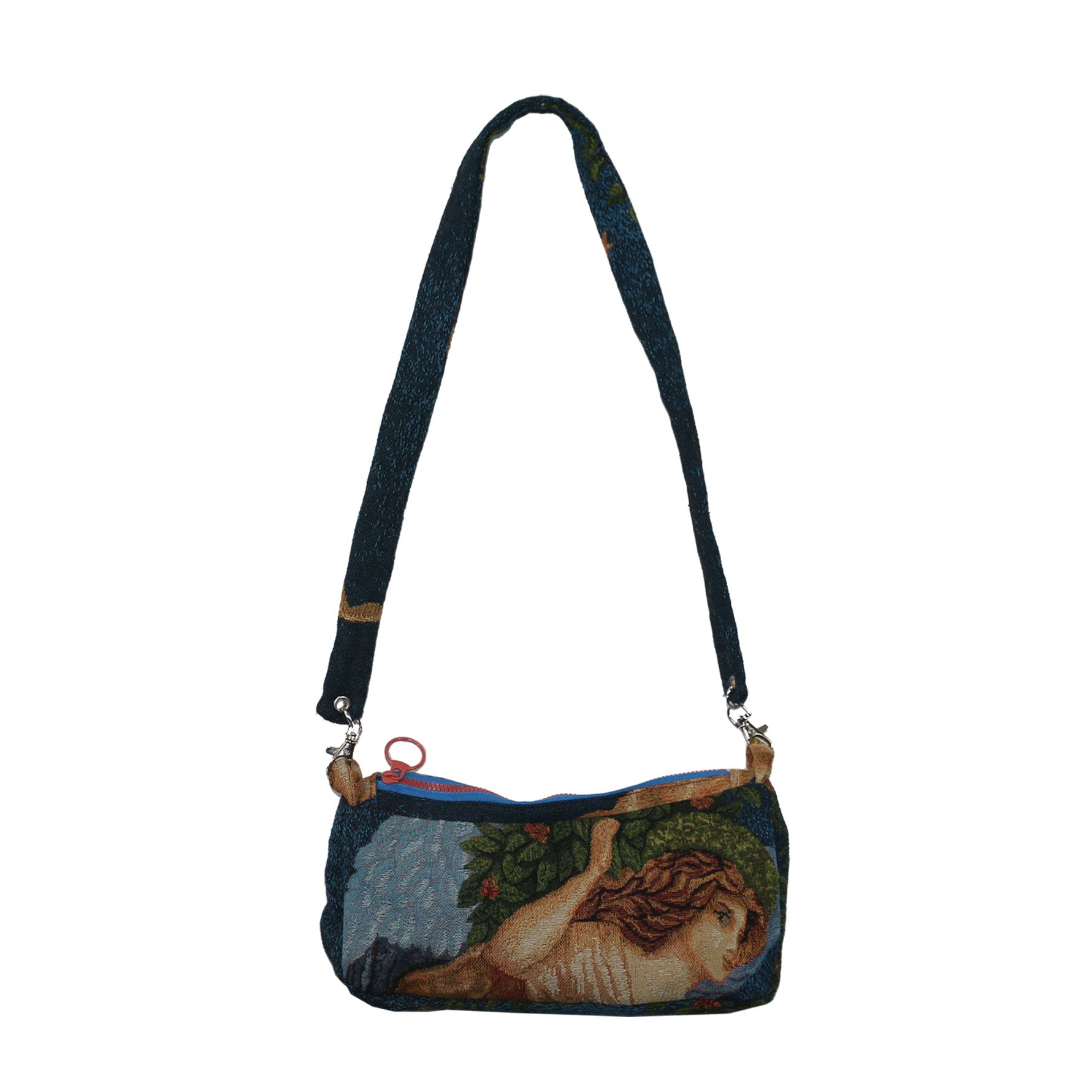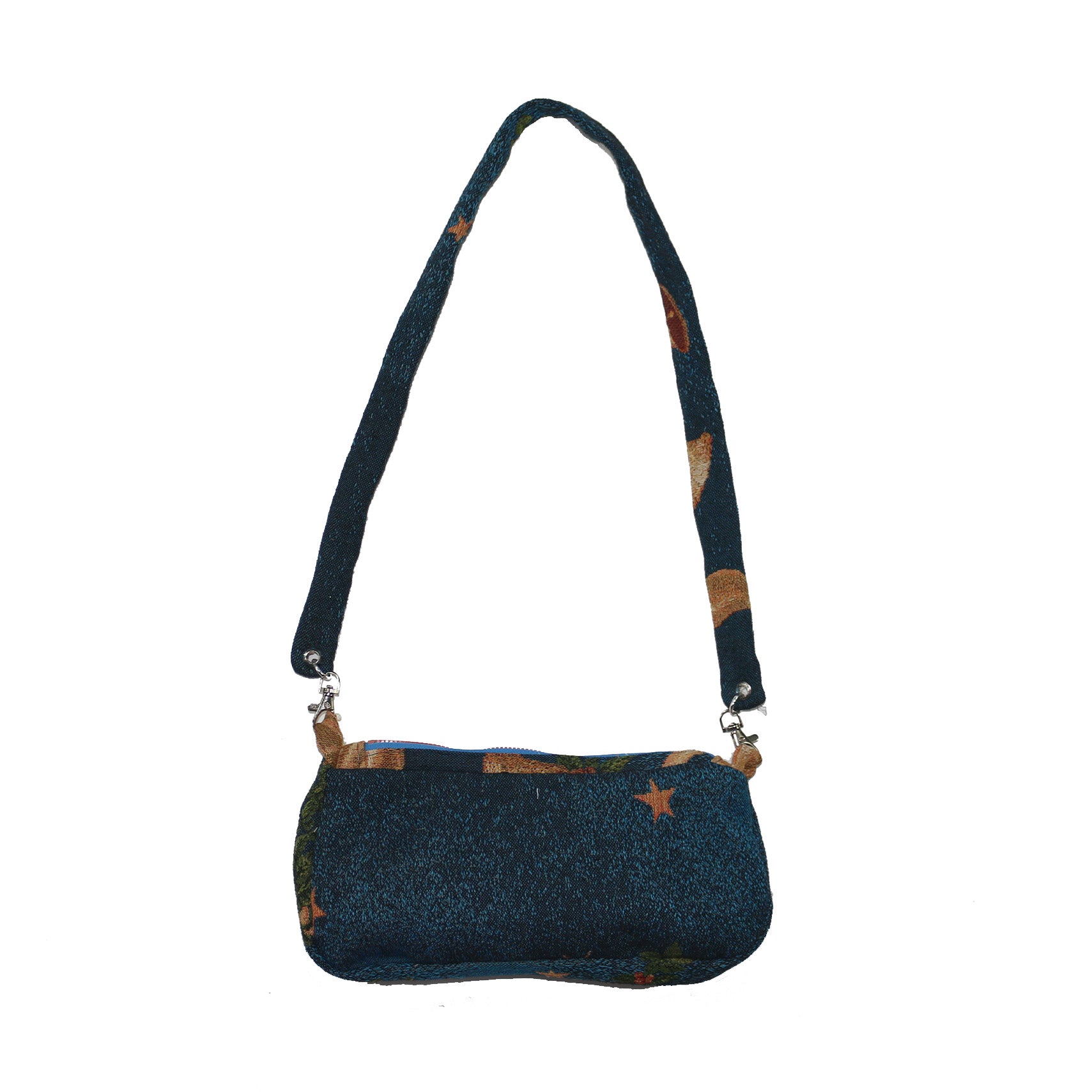 one of a kind mini bag made with recycled materials. fully lined with clip on over the shoulder strap