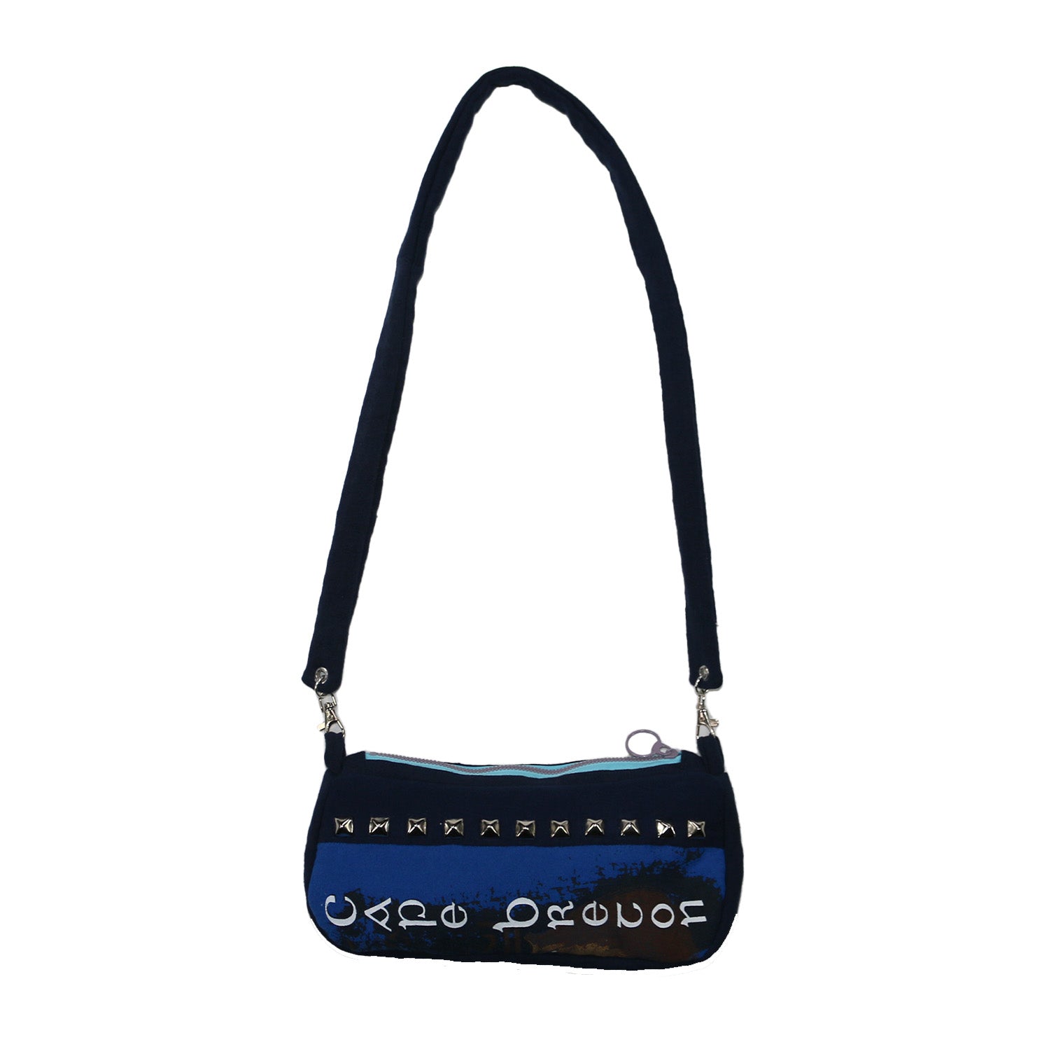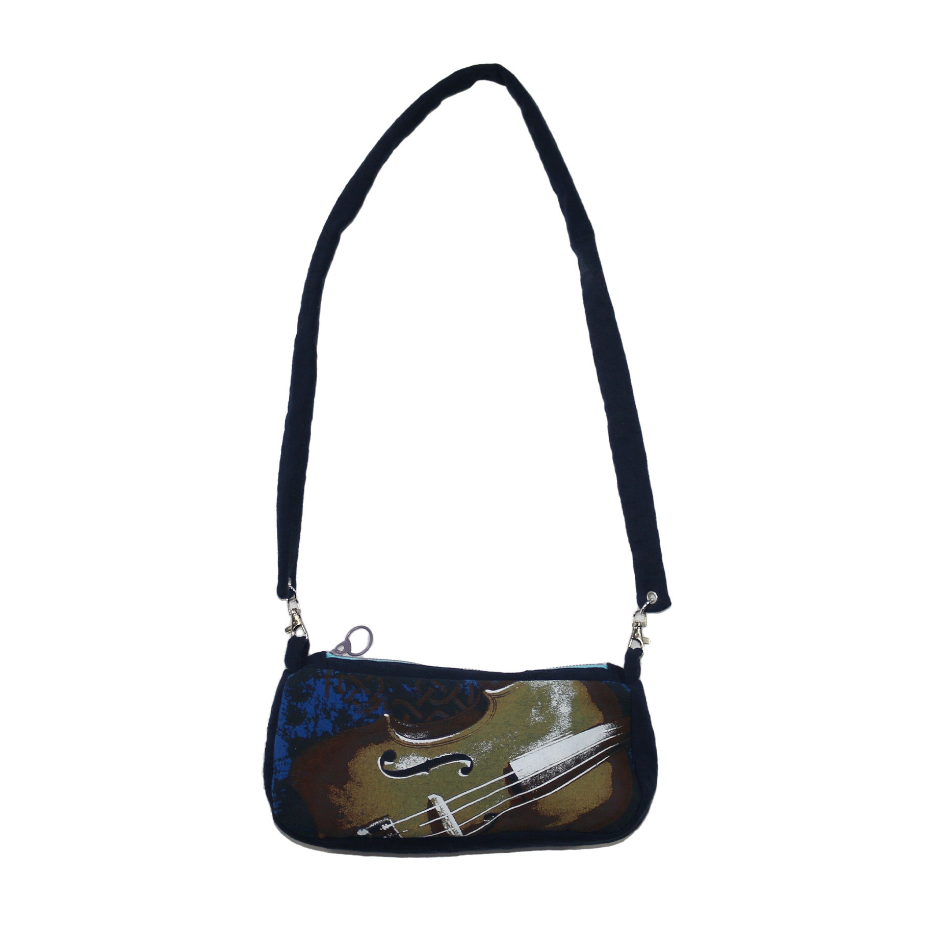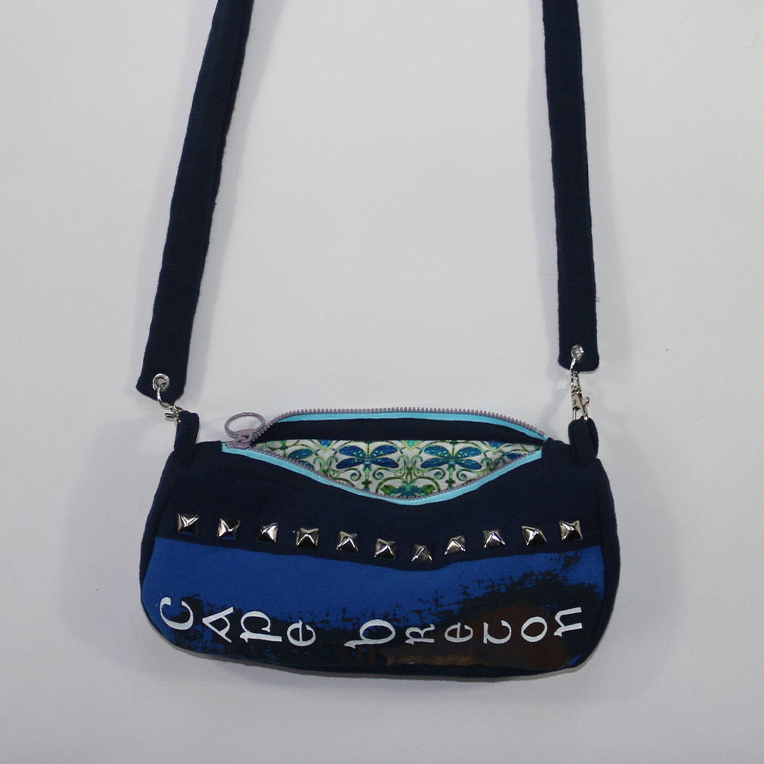 one of a kind mini bag made with recycled materials. fully lined with clip on over the shoulder strap