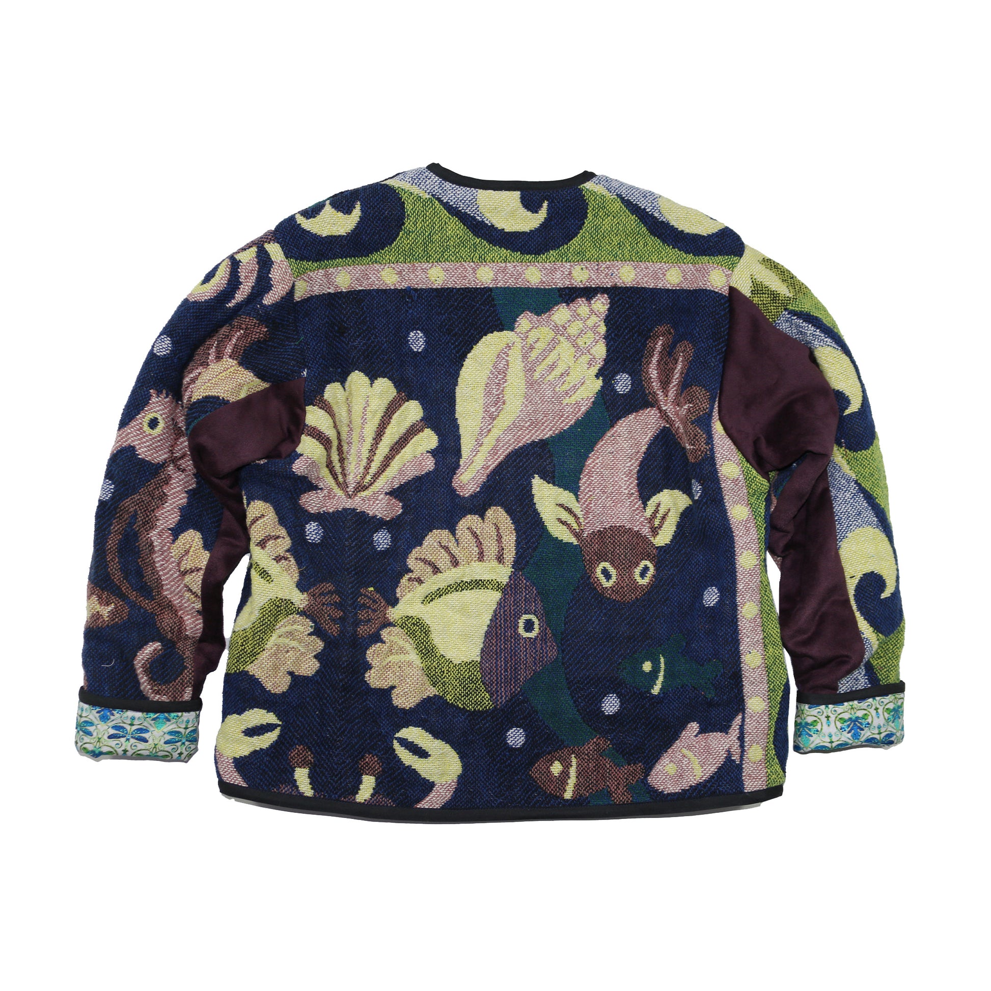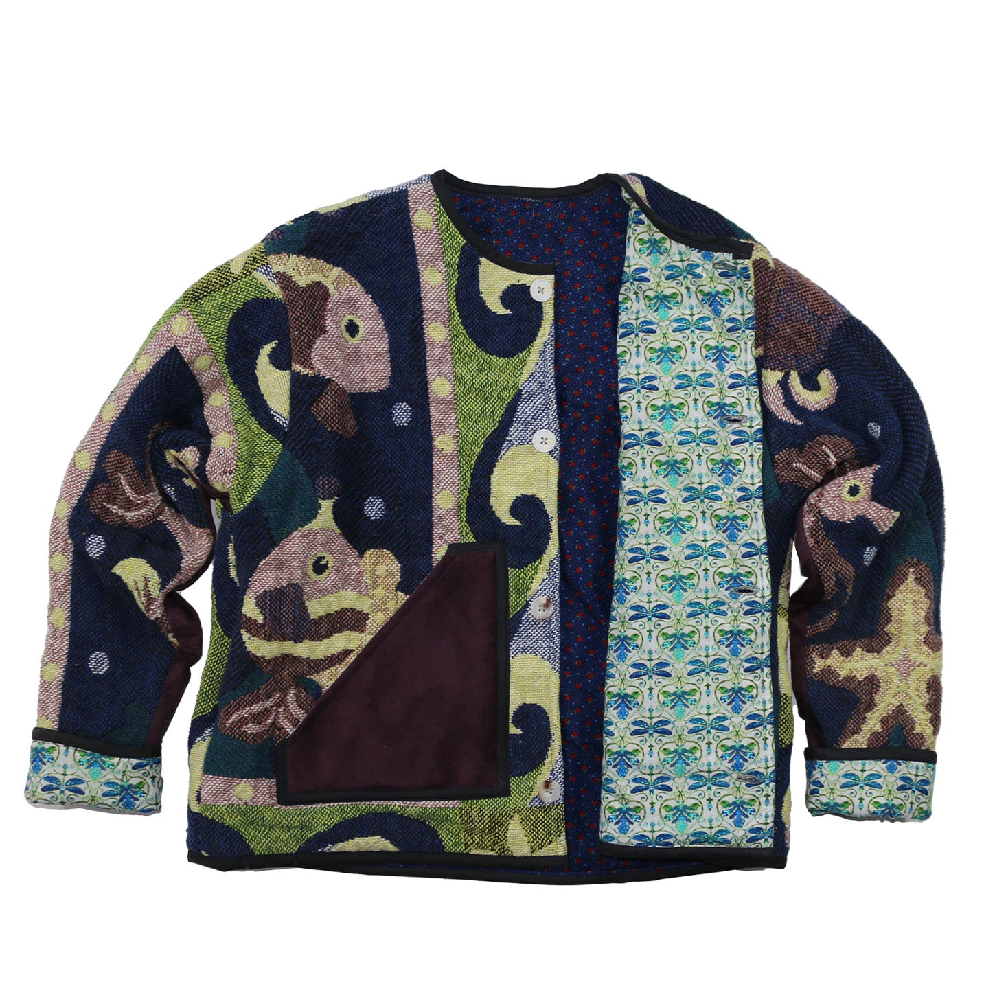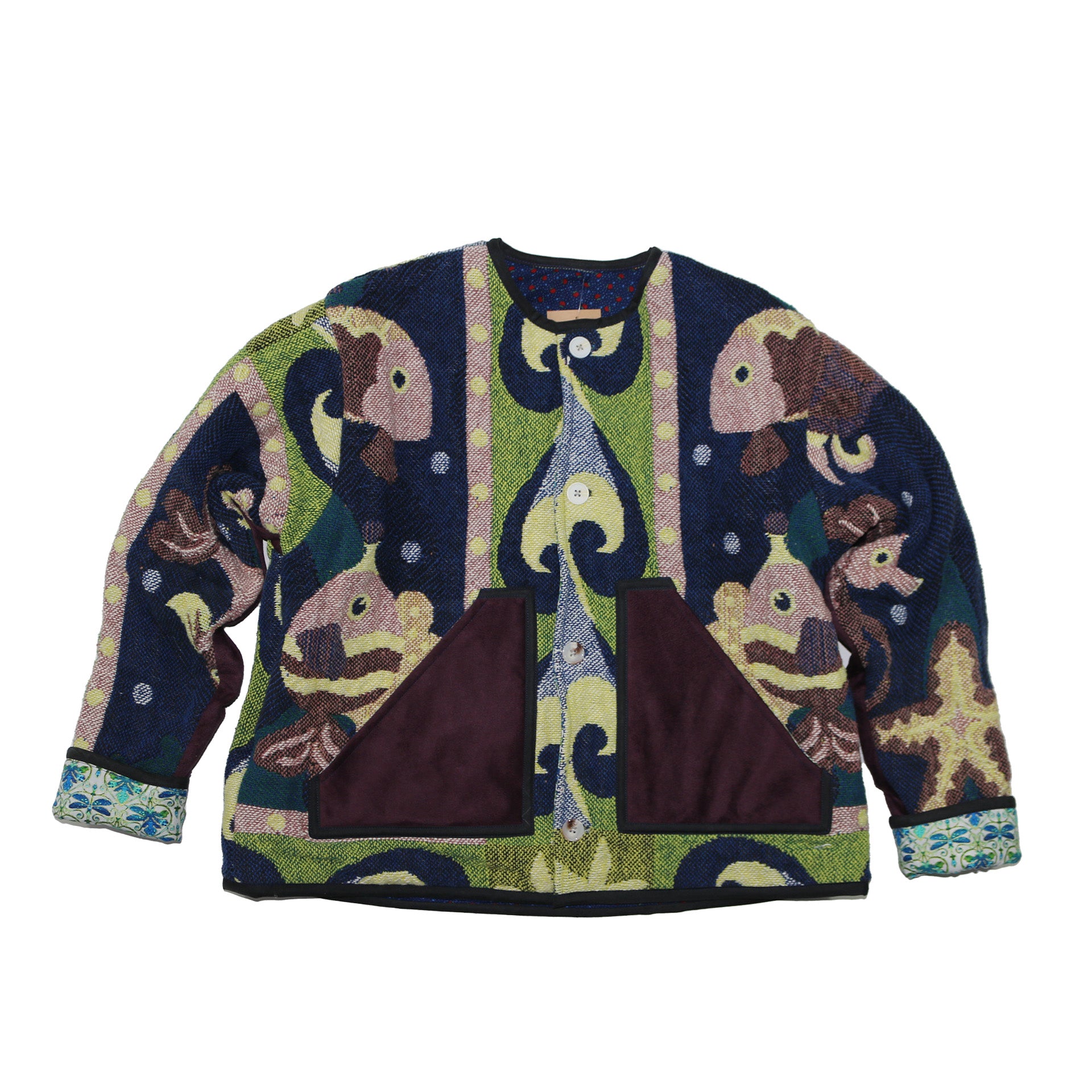 one of a kind jacket made with recycled materials. fully lined with vintage pearl buttons down the front.