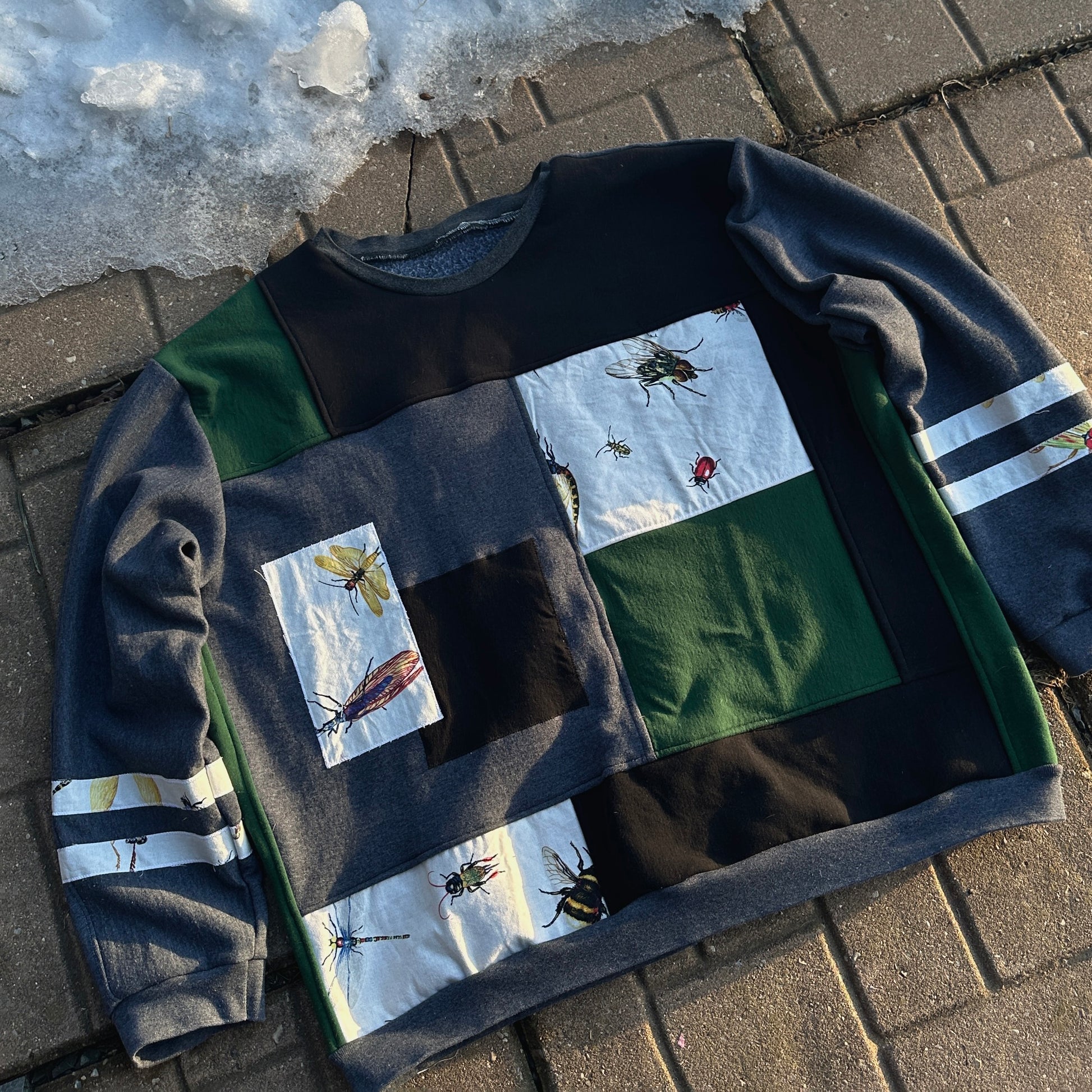 one of a kind patchwork crewneck made with recycled fabric scraps