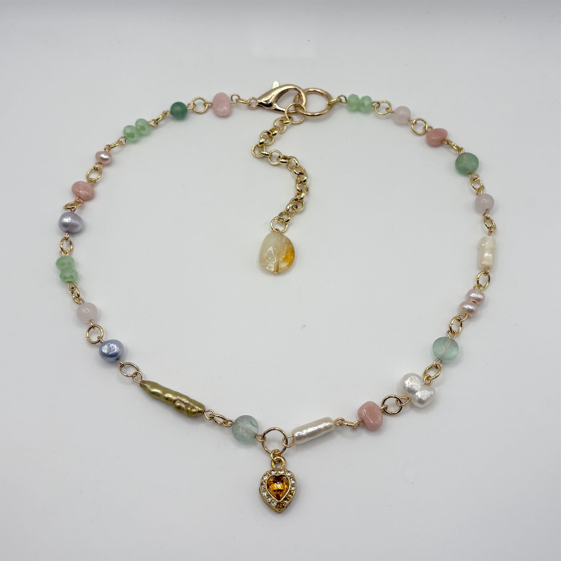 handbeaded necklace made of freshwater pearls, rose quartz, agate, citrine, crystals and jade. features a vintage pendant. adjustable chain