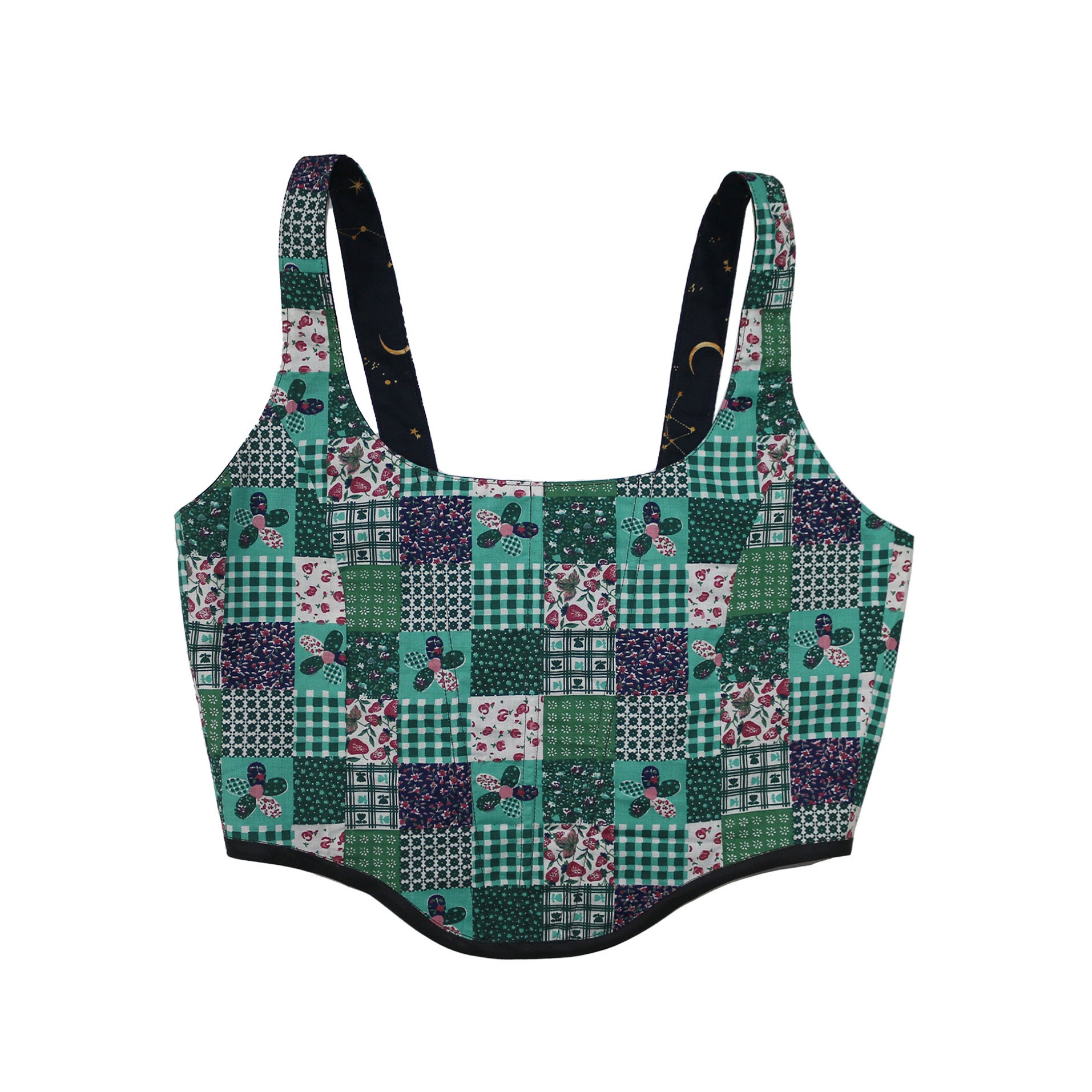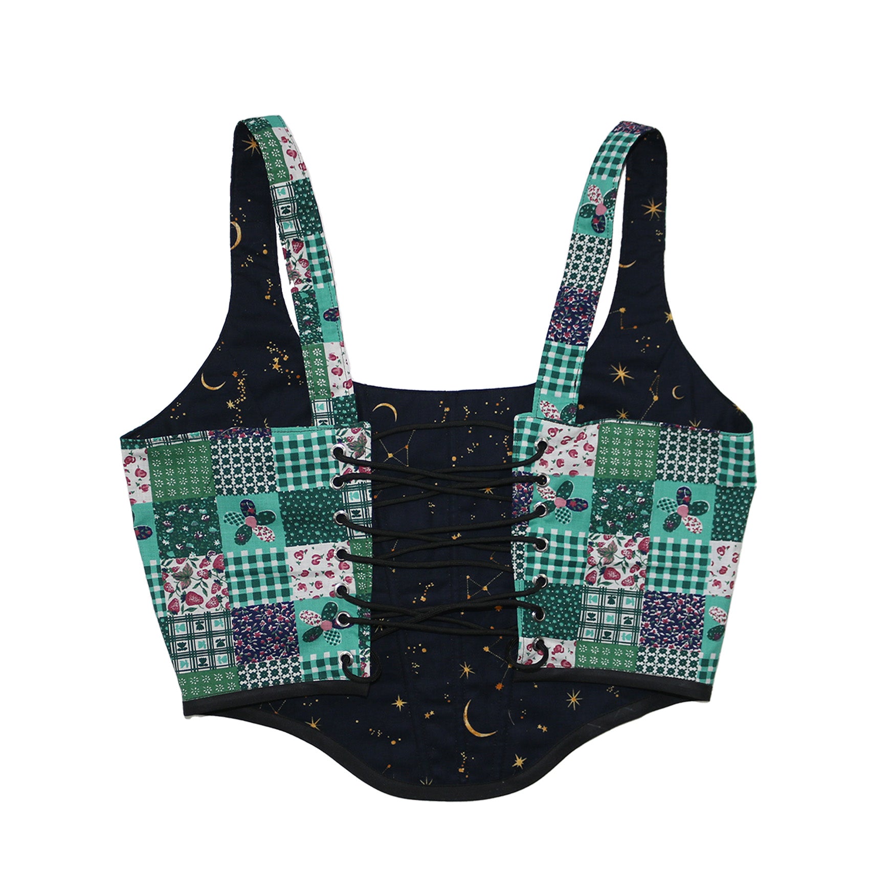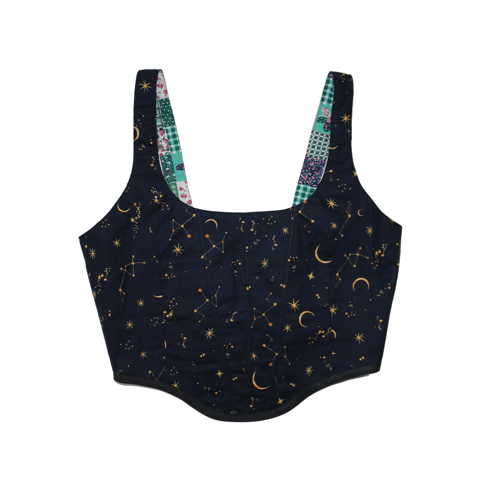 one of a kind corset hand made with recycled materials. fully boned with grommets in the back to lace up. fully reversible. (fully white on reverse side)