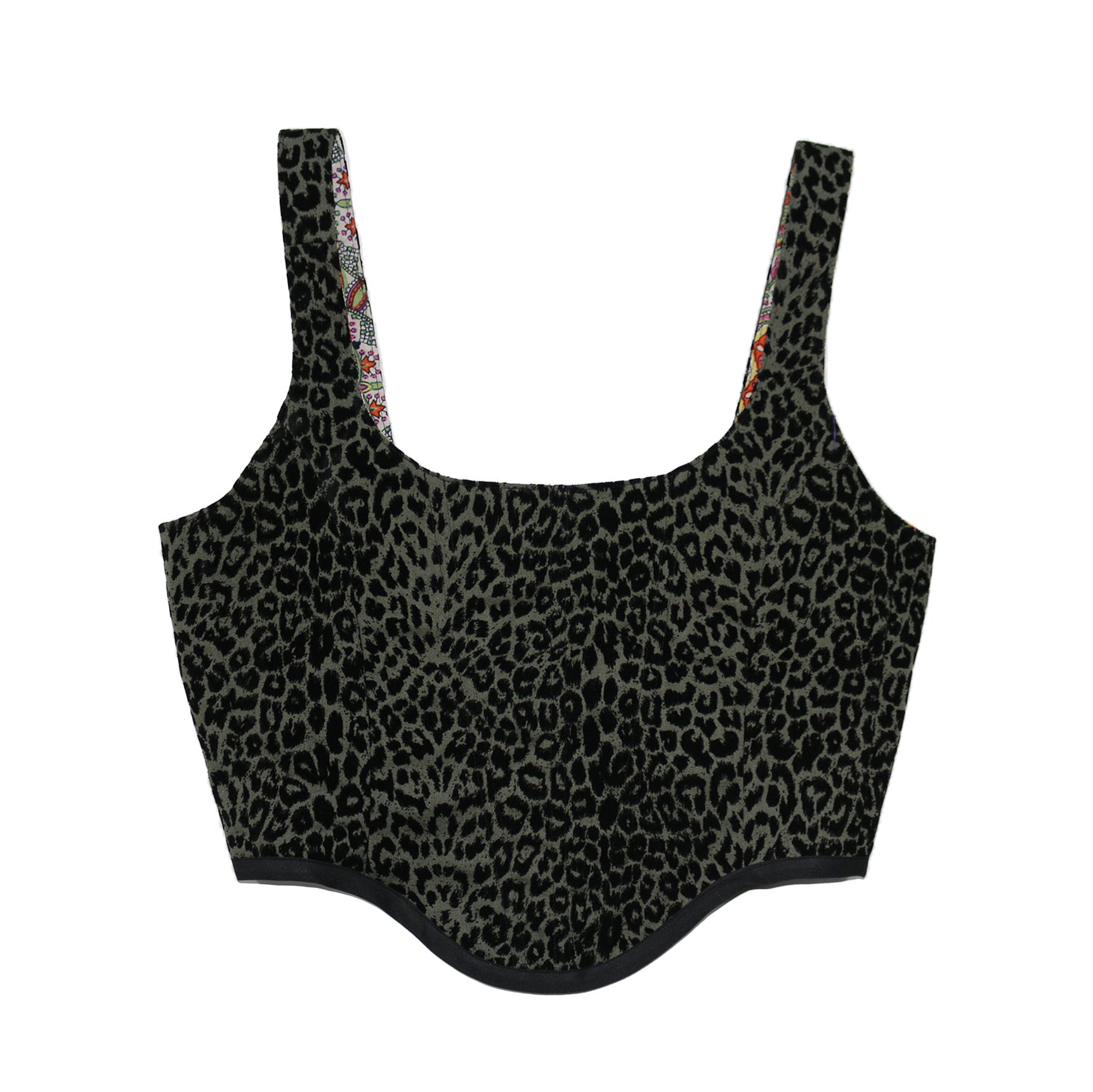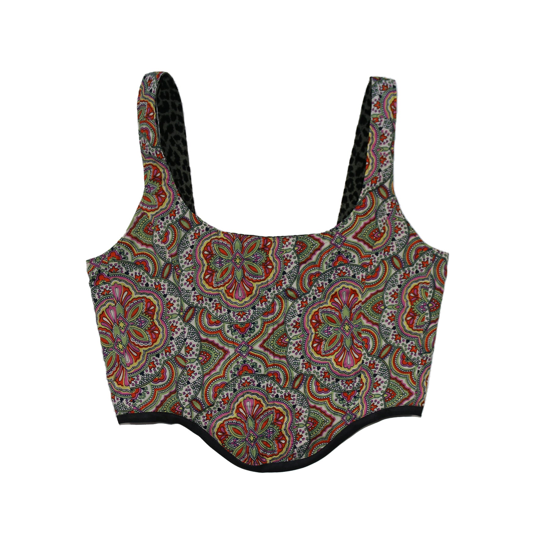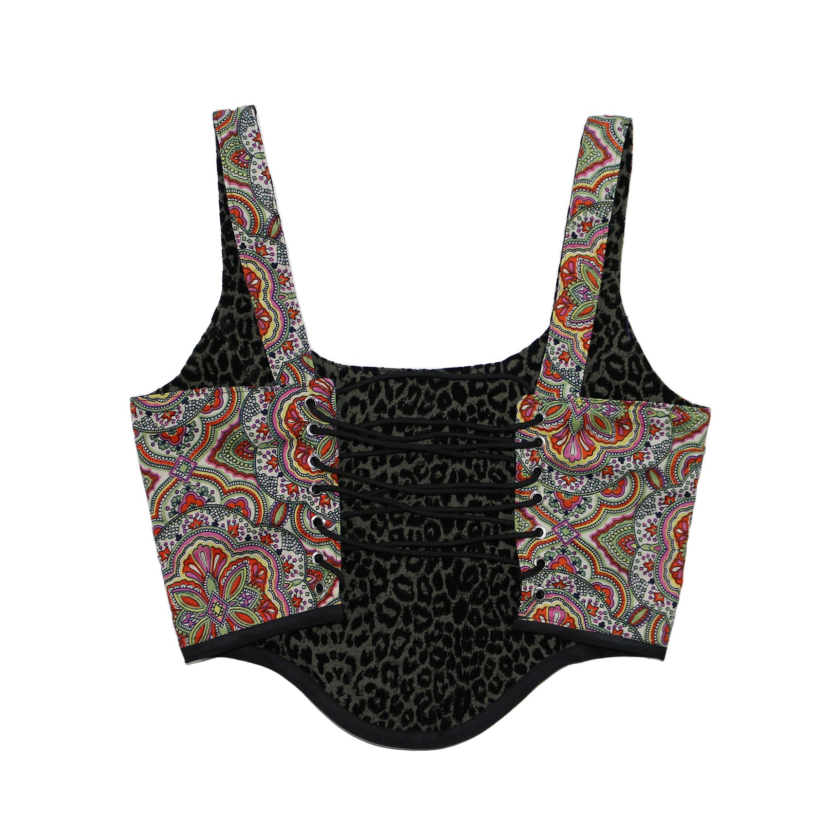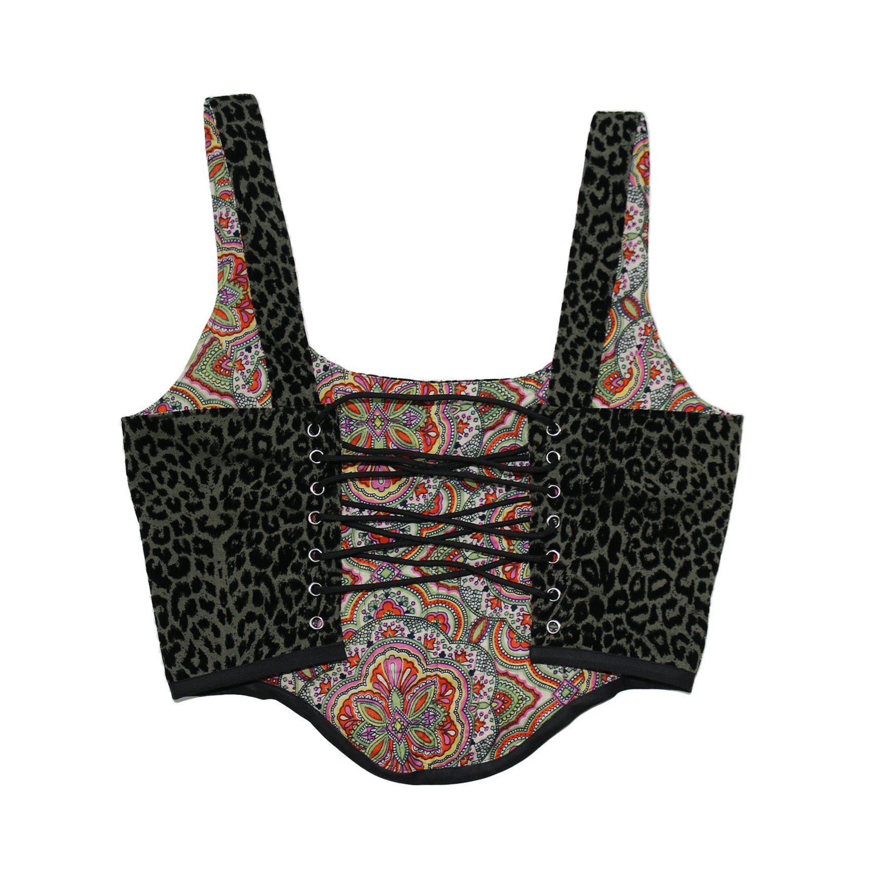 one of a kind corset hand made with recycled materials. fully boned with grommets in the back to lace up. fully reversible.