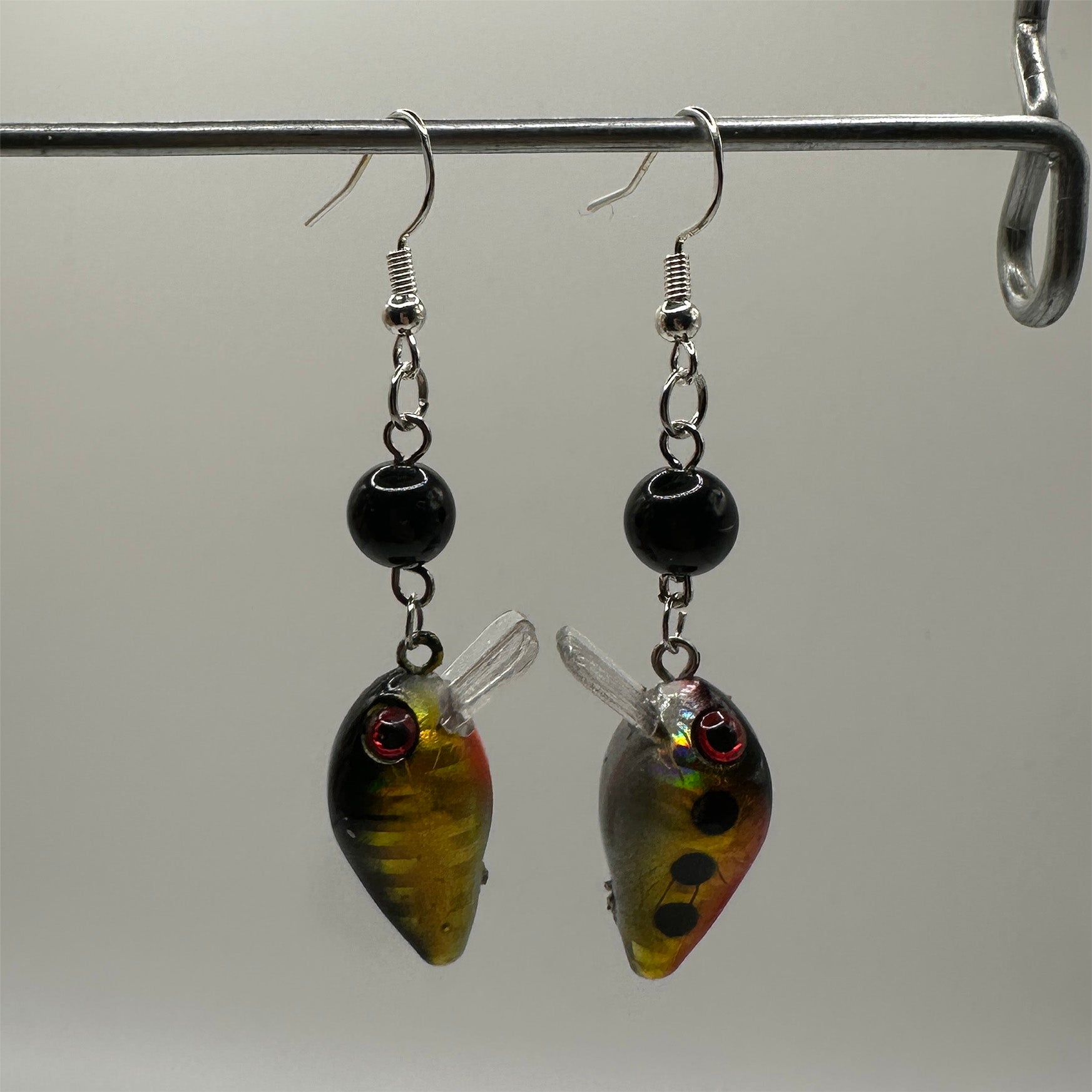 upcycled fishing lure earrings with 925 silver posts and agate beads.