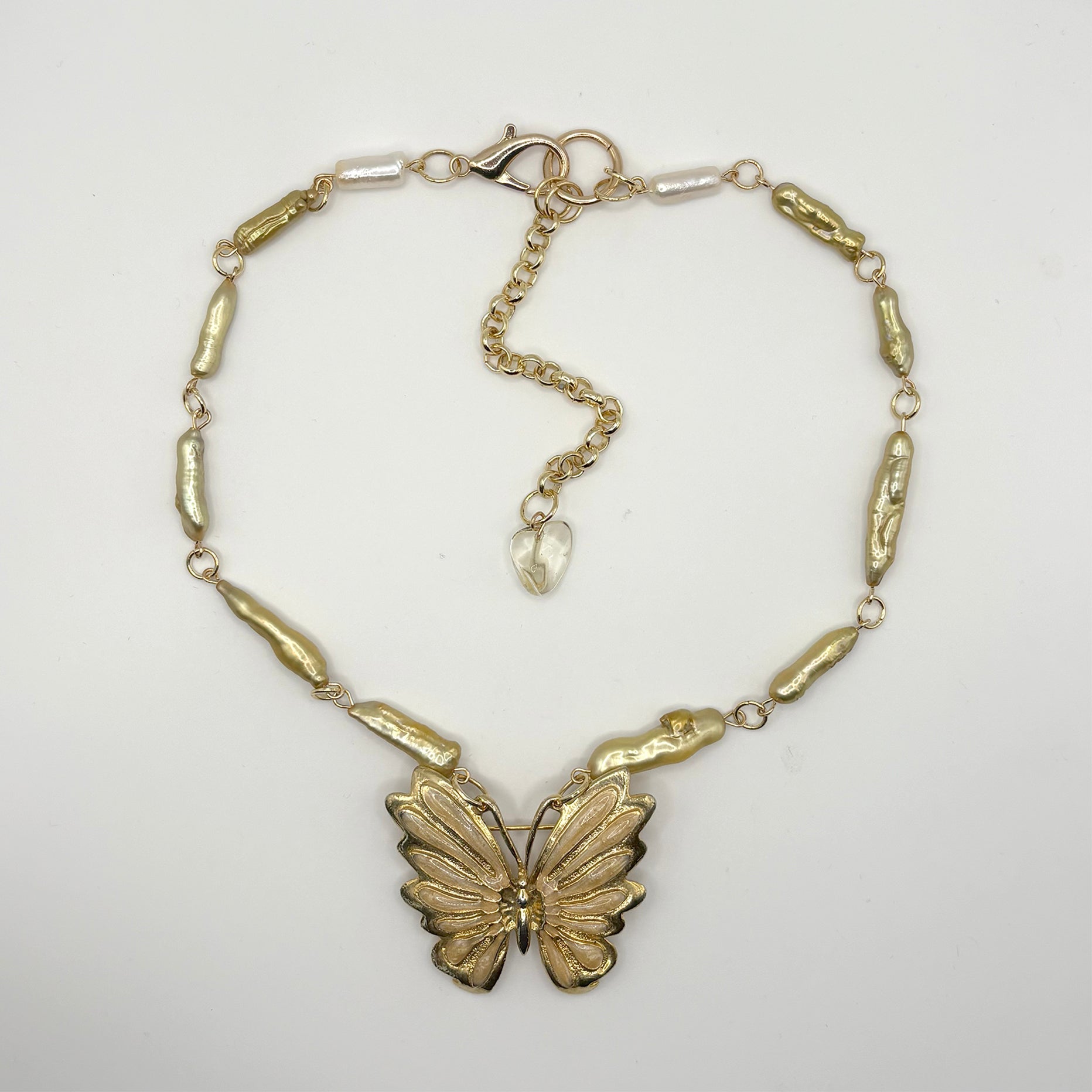 one of a kind necklace handmade with freshwater pearls. citrine and a vintage butterfly broach.