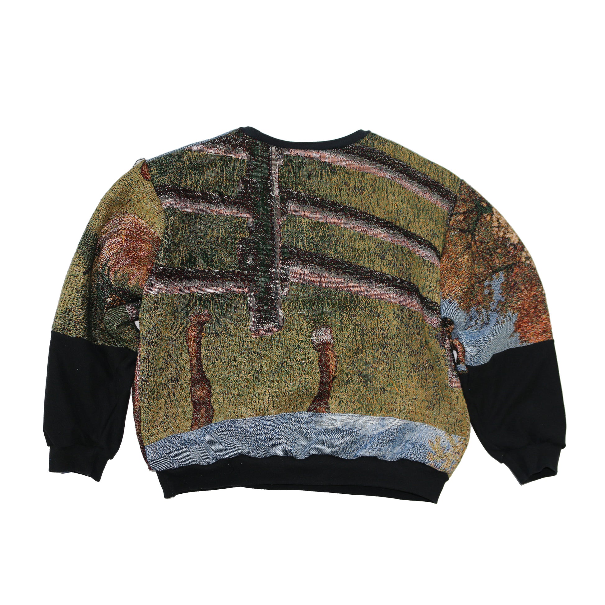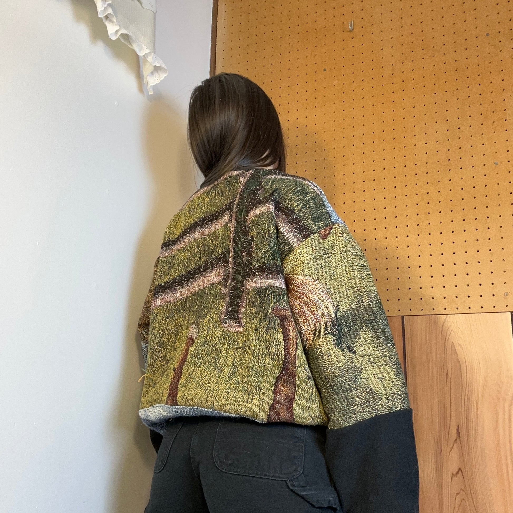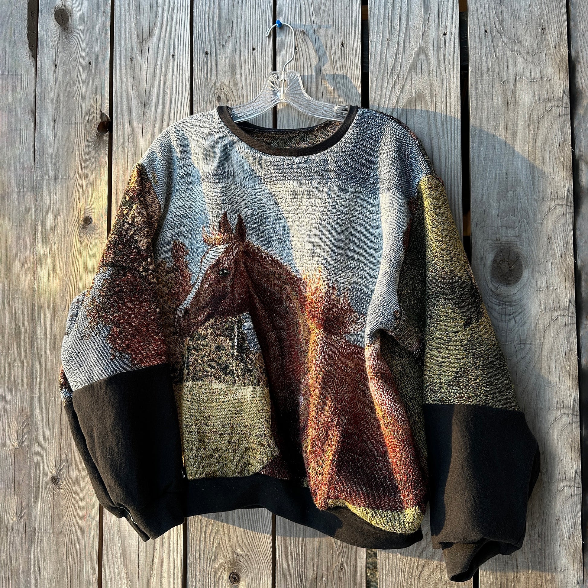 one of a kind crewneck sweater, handmade from a vintage tapestry blanket and other recycled fabric.