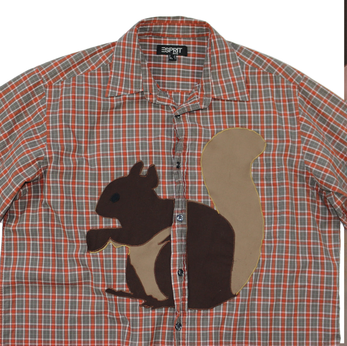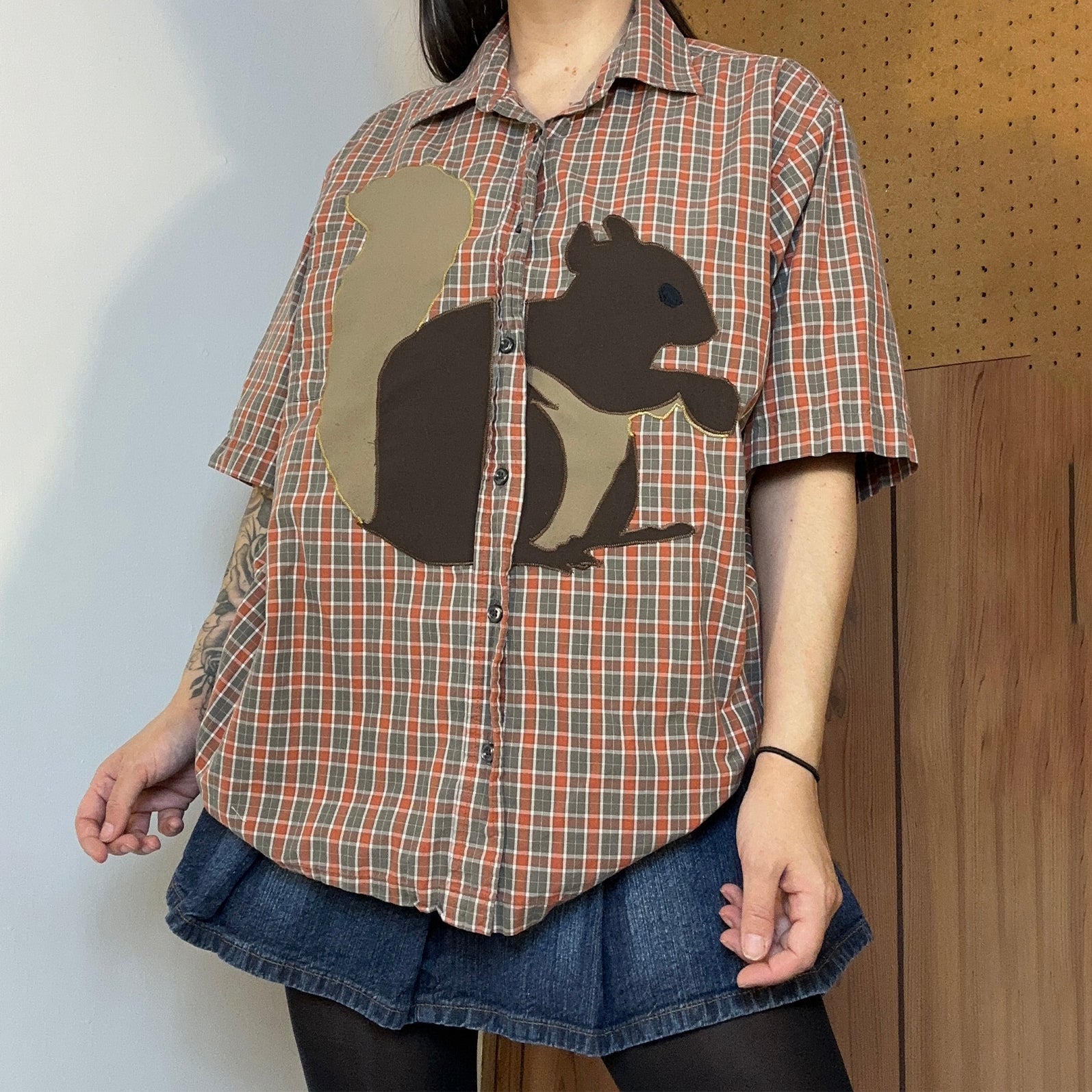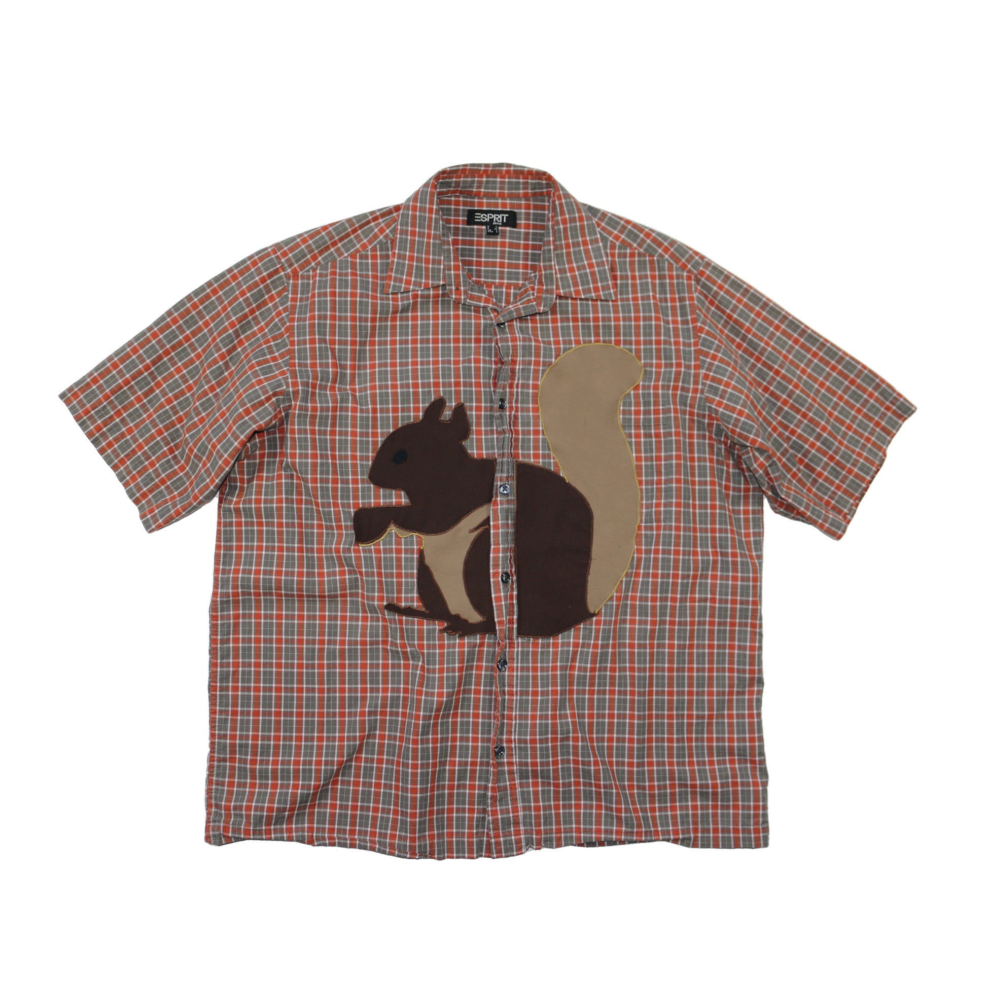 90s short sleeve espirit button down with a giant squirrel applique.