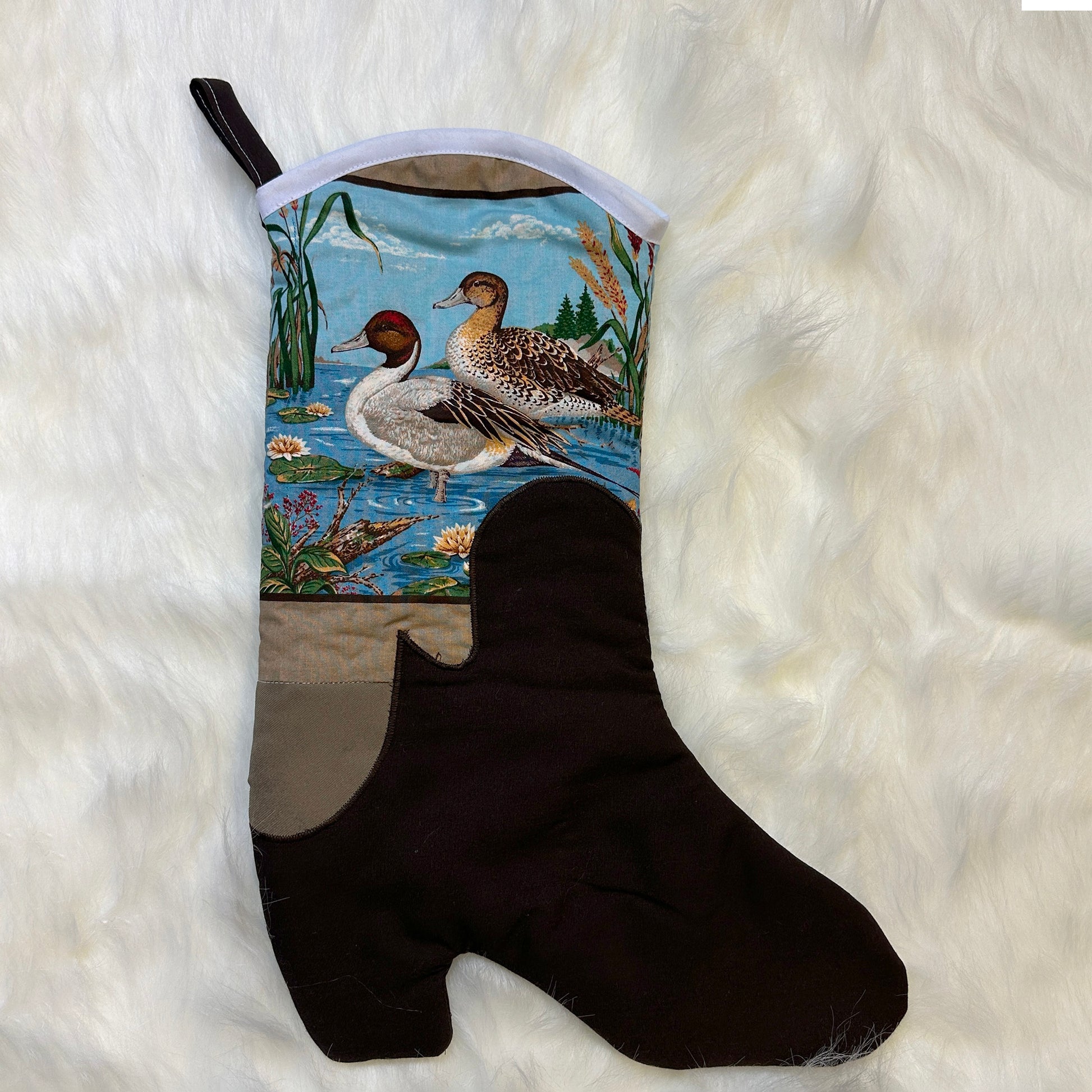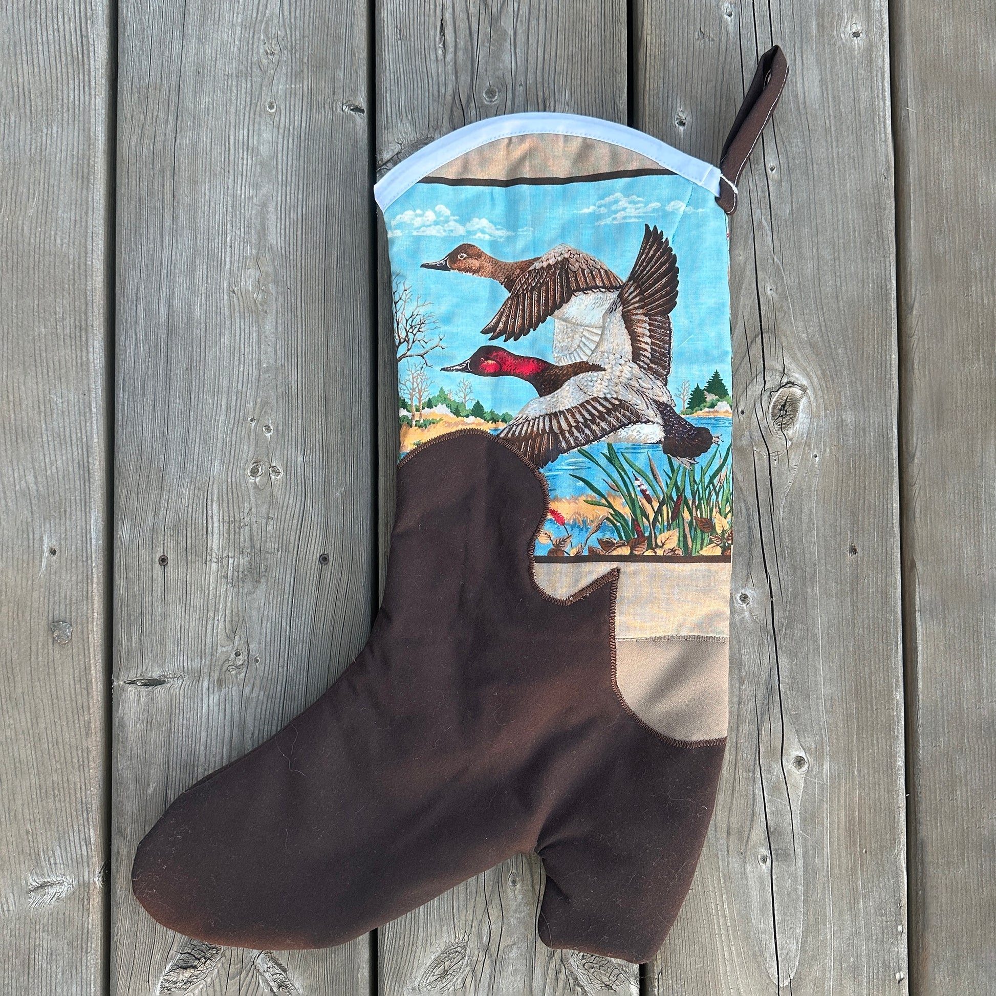 one of a kind, handmade stocking crafted with recycled quilts and fabrics. fully lined, with a hang tab on the back of the boot.