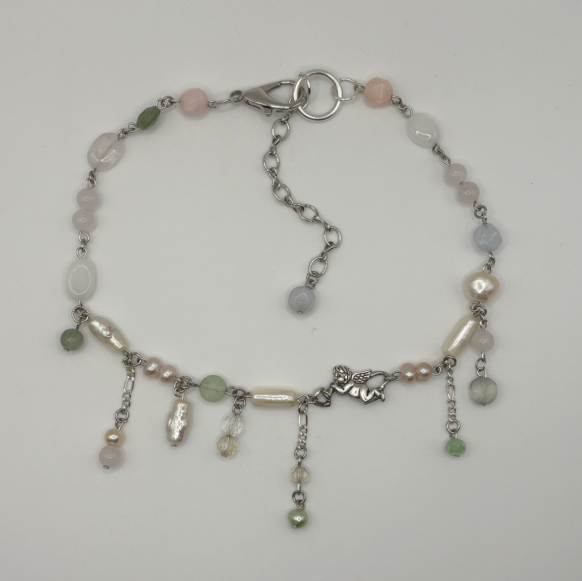 dainty dangly necklace made with freshwater pearls, rose quartz, agate, jade and other crystals with a vintage charm. adjustable chain