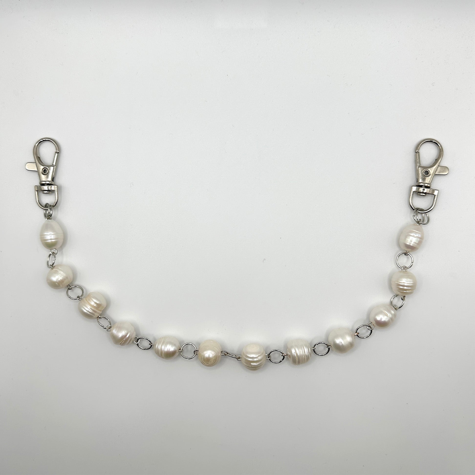 one of a kind clip on bag chain made with freshwater pearls.