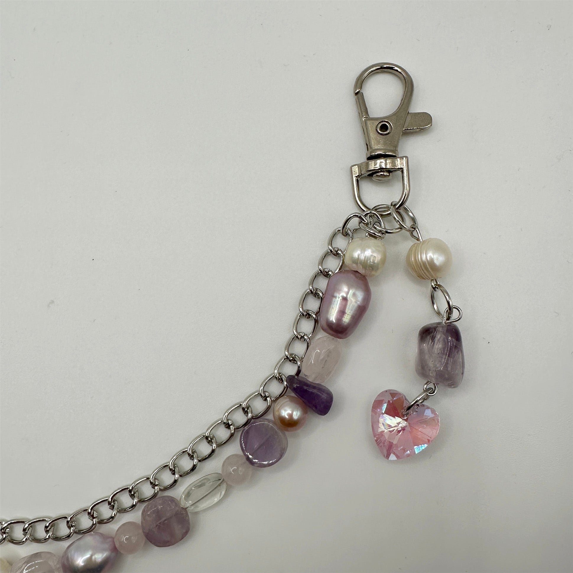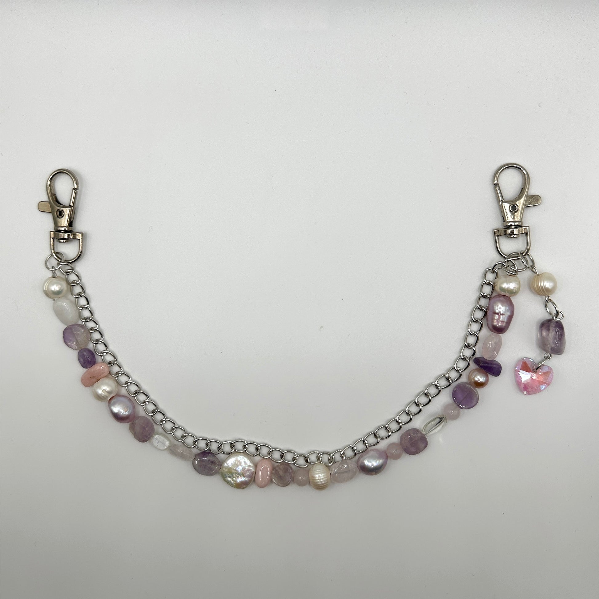 one of a kind clip on bag chain made with freshwater pearls, amethyst, rose quartz, agate and glass beads.