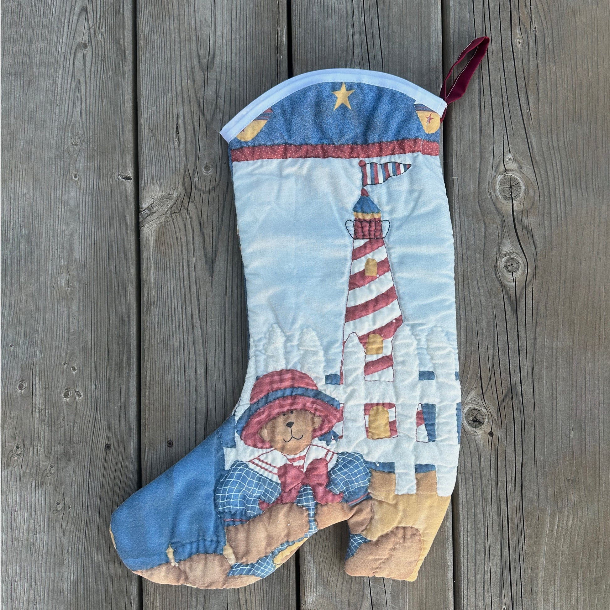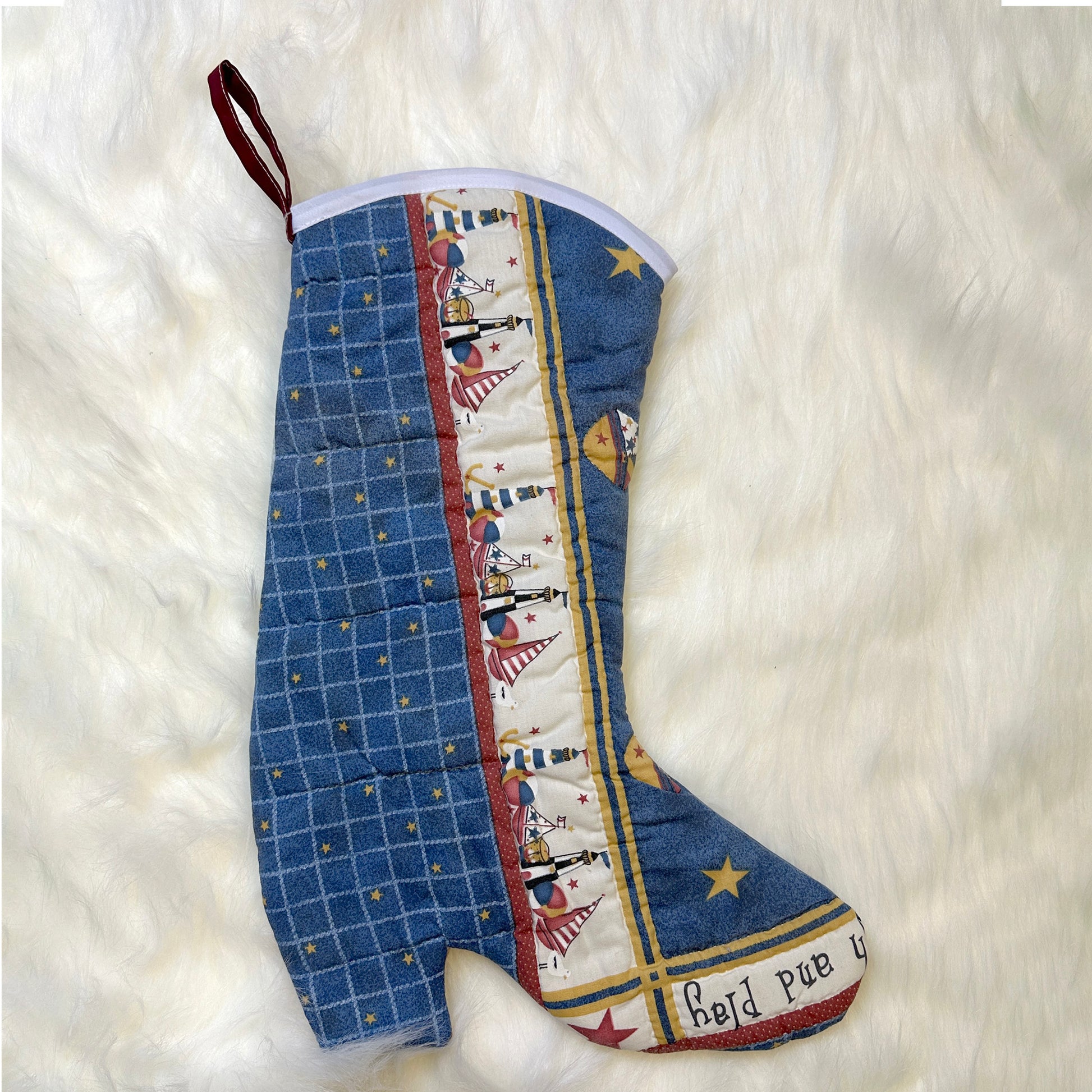 one of a kind, handmade stocking crafted with recycled quilts and fabrics. fully lined, with a hang tab on the back of the boot.
