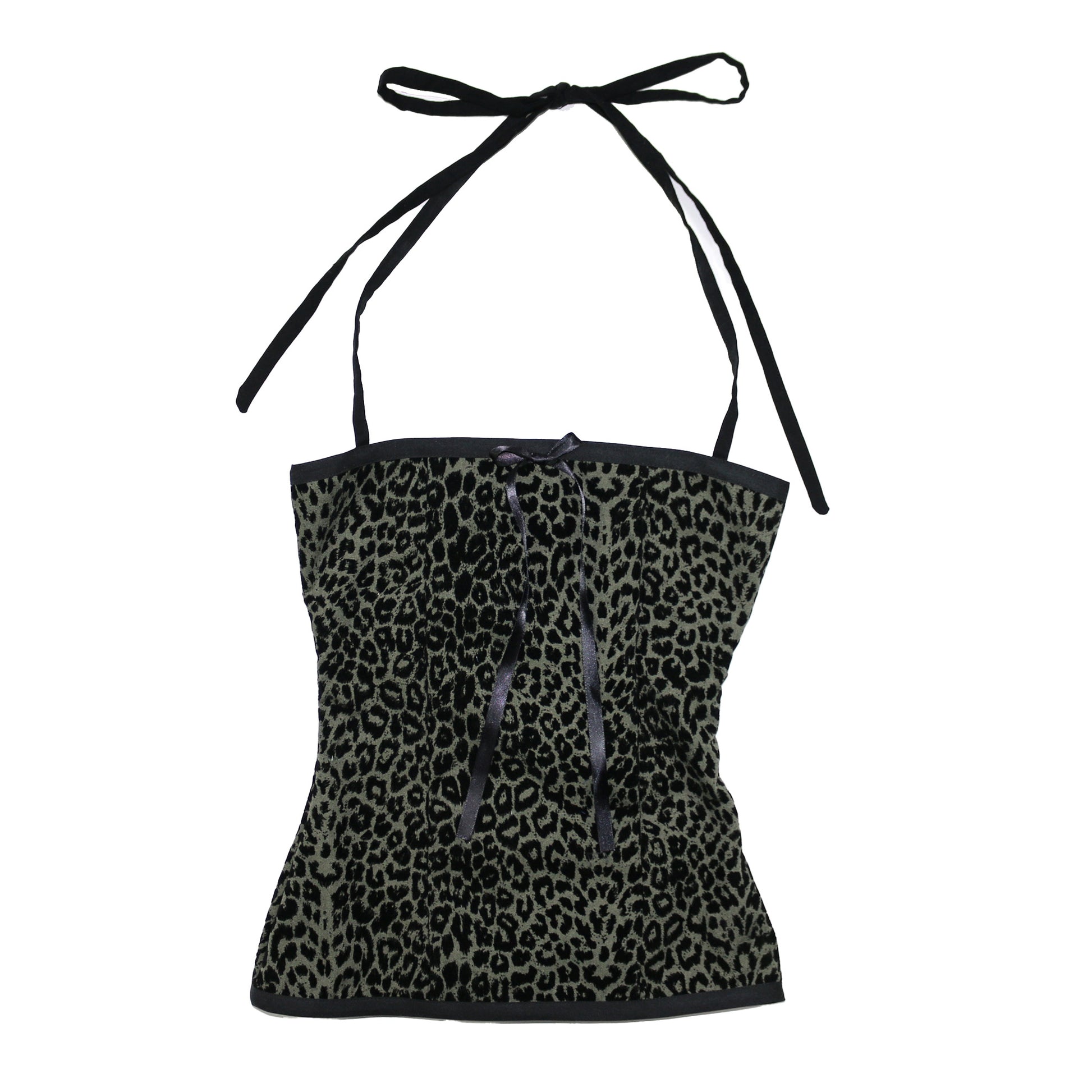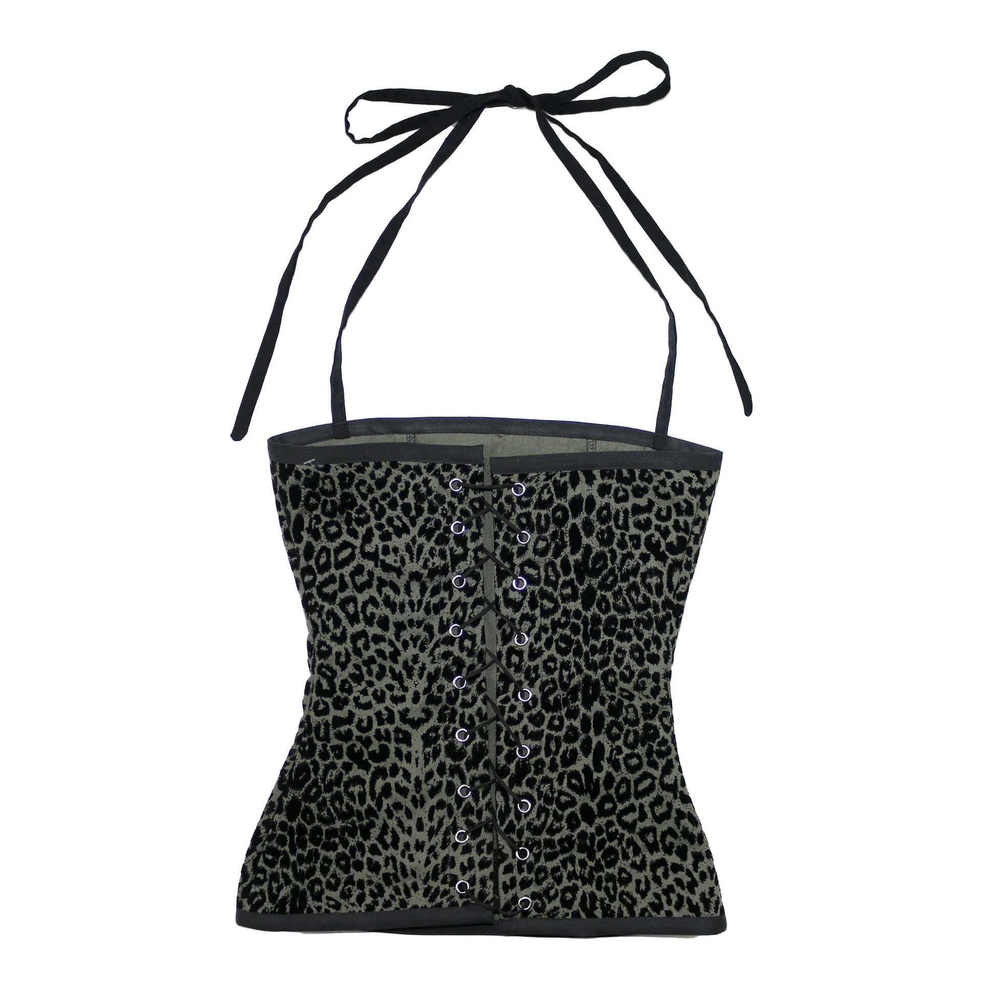 little cutie top with halter straps and a corsetted open back. made with recycled materials.