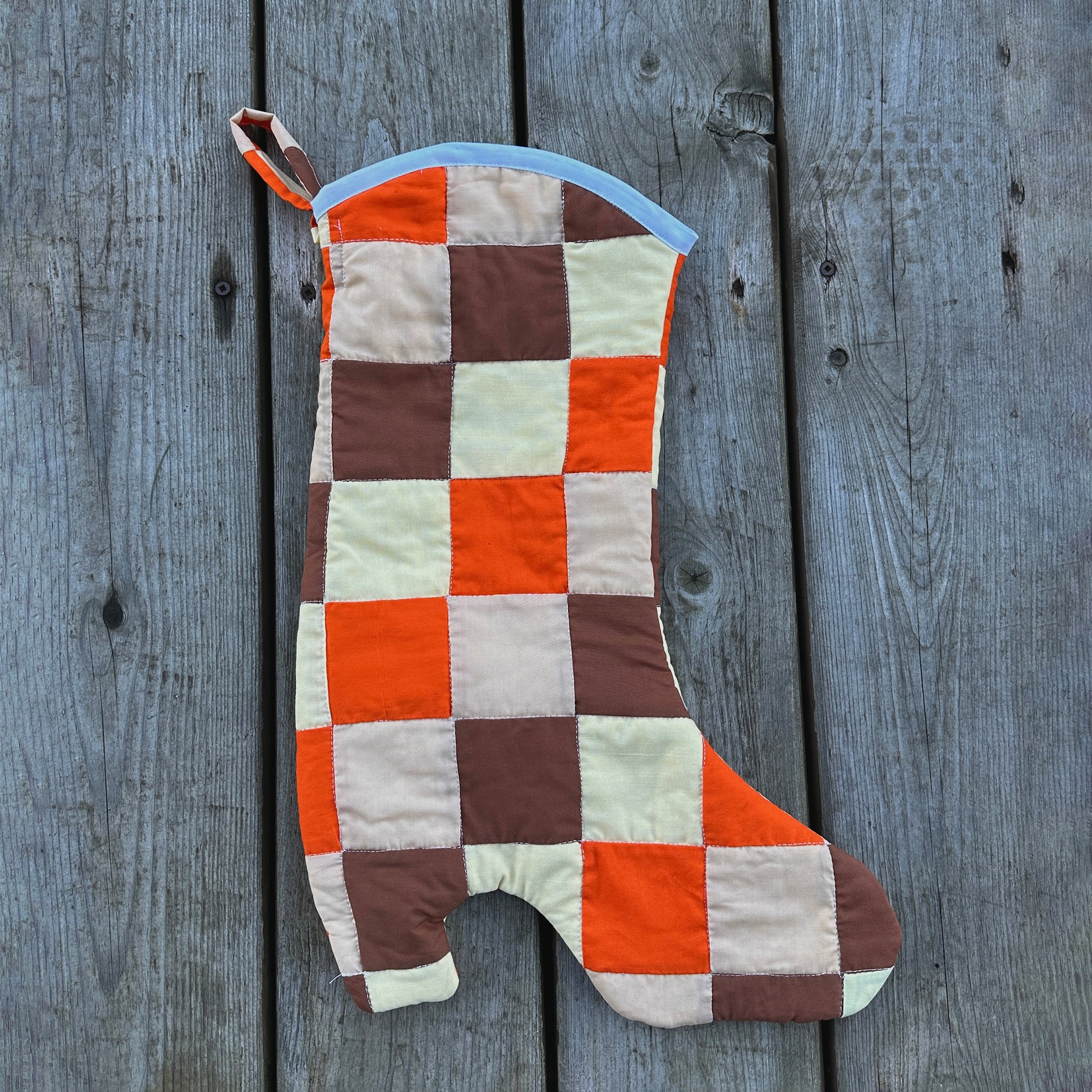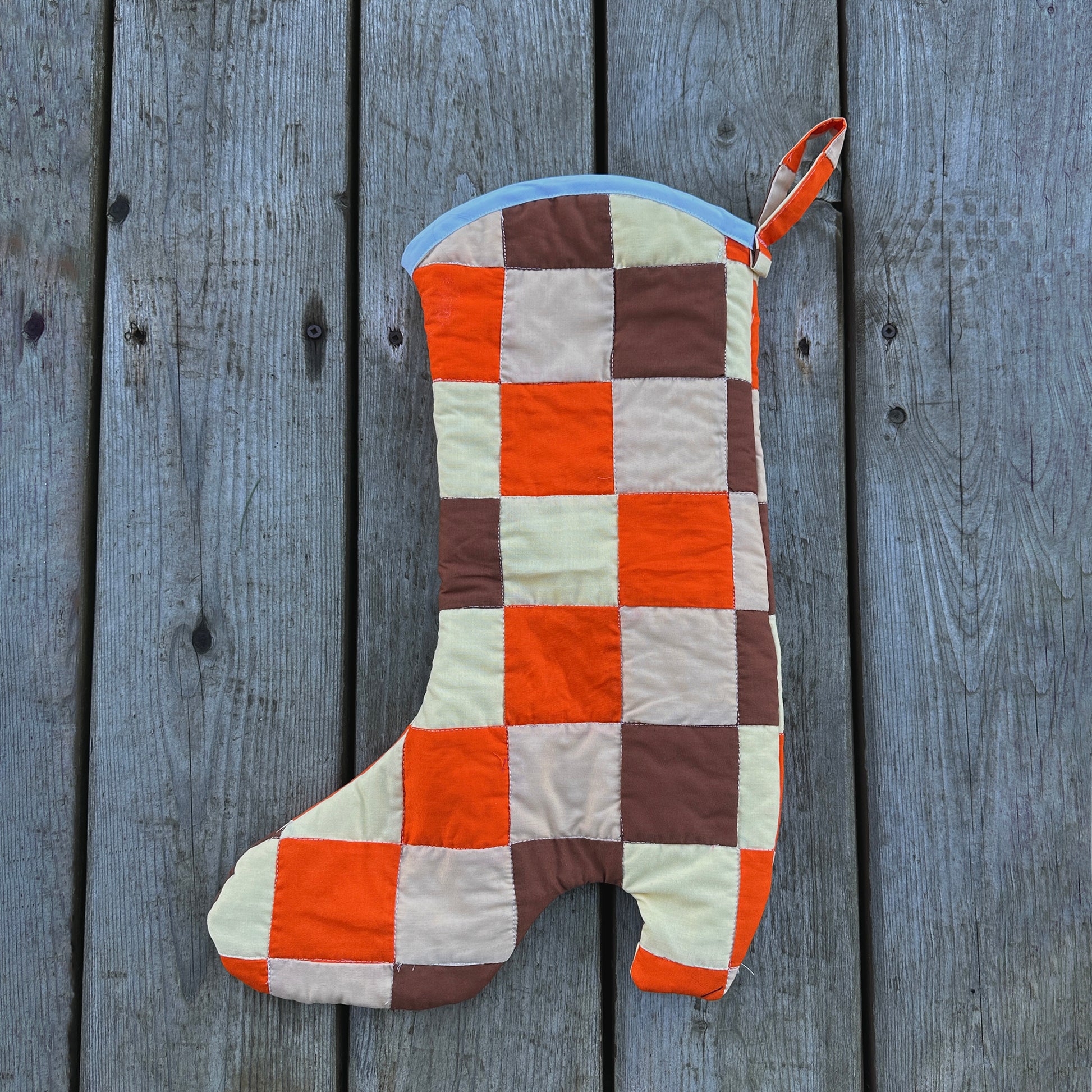 one of a kind, handmade stocking crafted with recycled quilts and fabrics. fully lined, with a hang tab on the back of the boot.