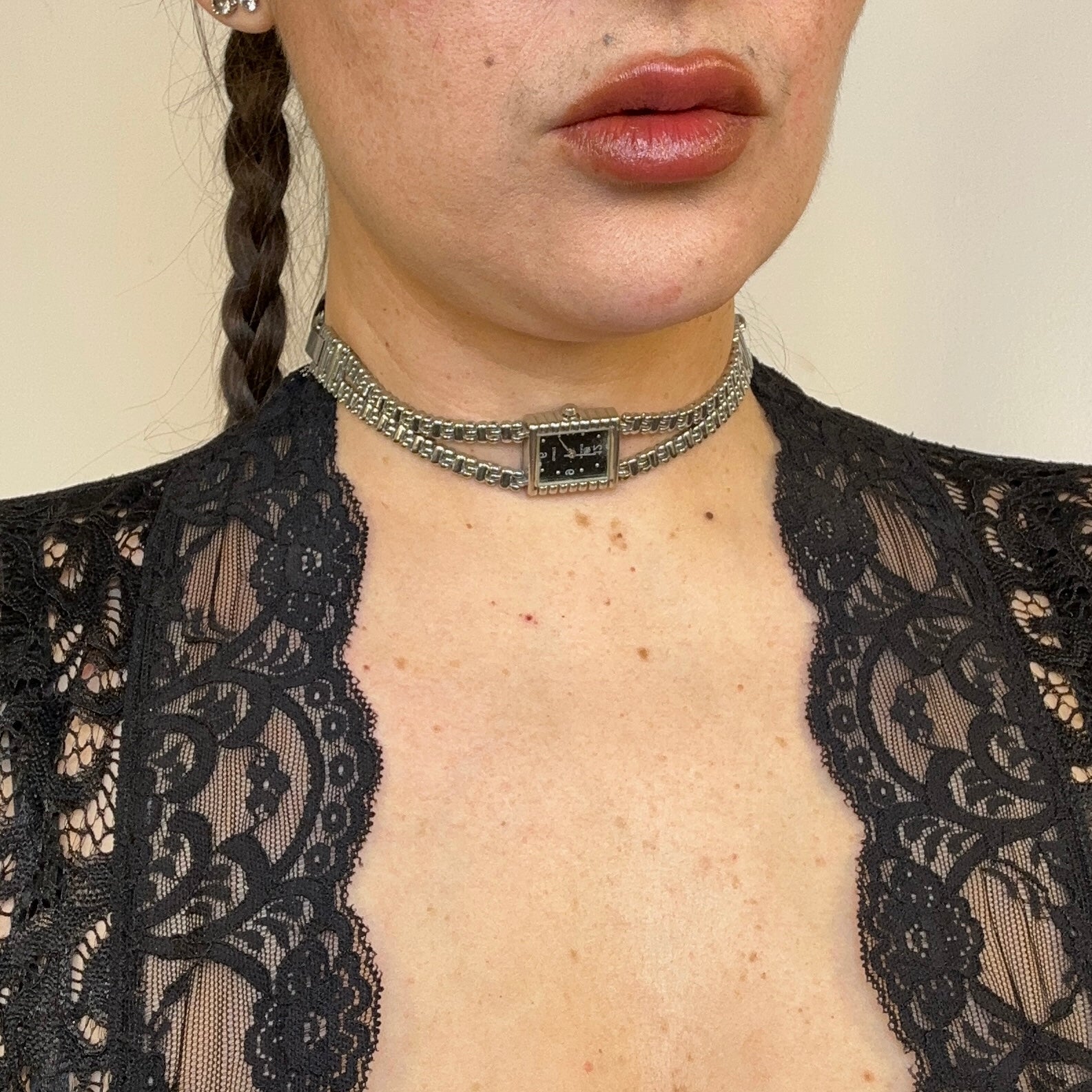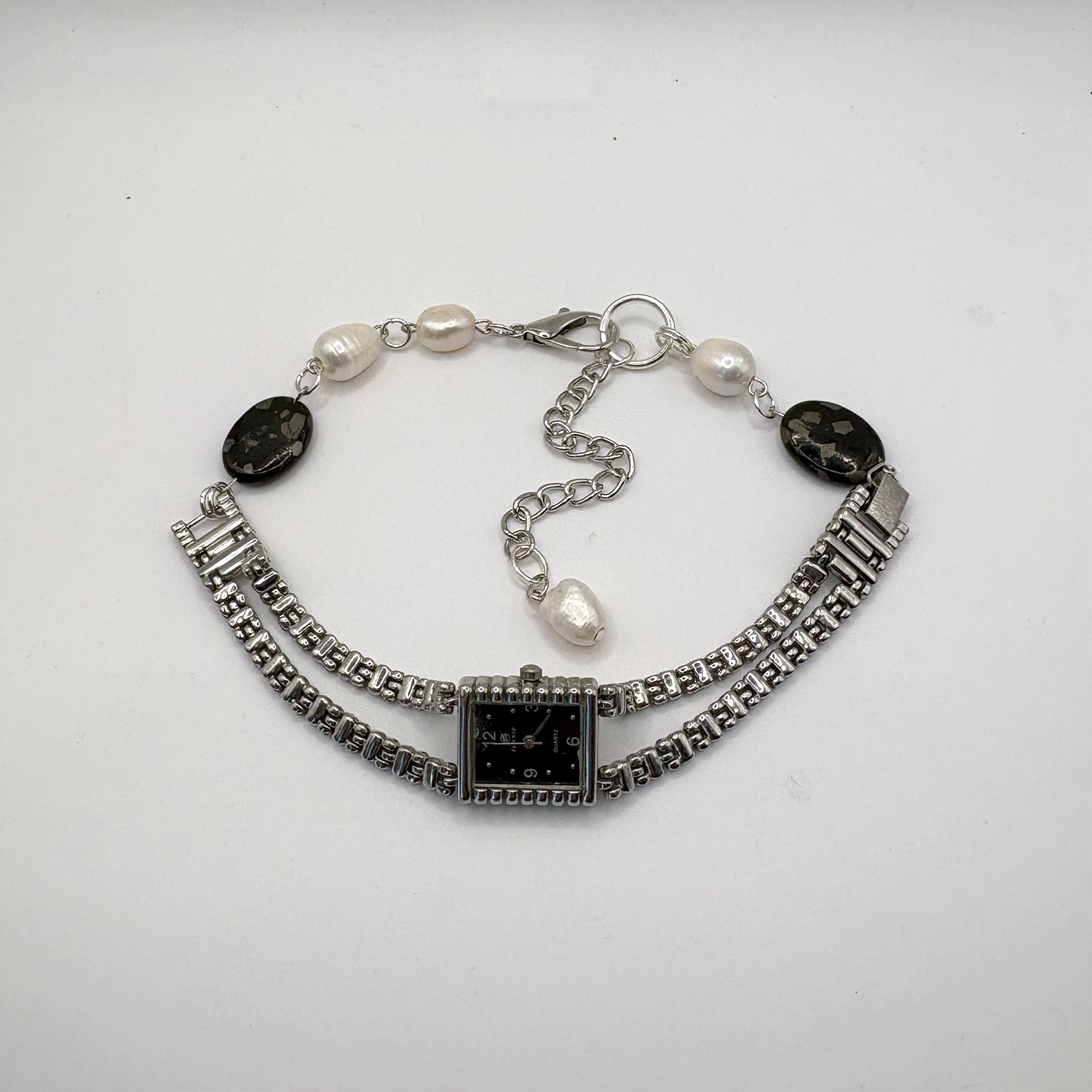 one of a kind choker upcycled with a vintage watc, freshwater pearls and black agate.